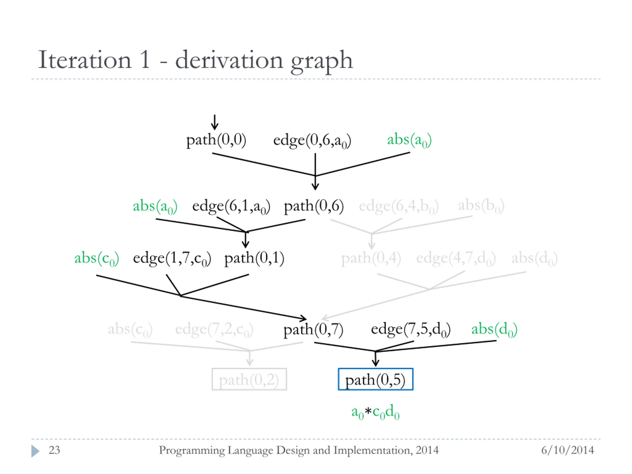 Iteration 1 - derivation graph abs(a0) path(0,0) edge(0,6,a0) abs(b0) abs(a0) edge(6,1,a0) path(0,6) edge(6,4,b0) abs(d0) edge(4,7,d0) abs(c0) edge(1,7,c0) path(0,1) path(0,4) abs(c0) edge(7,2,c0) edge(7,5,d0) abs(d0) path(0,7) path(0,2) path(0,5) a0 c0 22 Programming Language Design and Implementation, 2014 6/10/2014