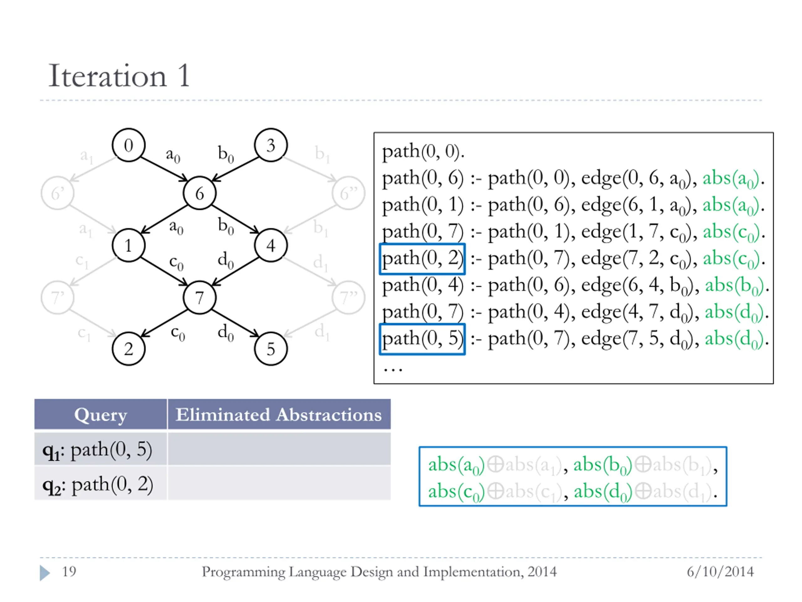 Iteration 1 - derivation graph 0 3 a0 b0 b1 a1 6 6 6 a0 b0 b1 a1 1 4 c1 d0 c0 d1 7 7 7 c0 d1 d0 c1 2 5 Query Eliminated Abstractions q1: path(0, 5) q2: path(0, 2) abs(a0) abs(a1), abs(b0) abs(b1), abs(c0) abs(c1), abs(d0) abs(d1). 20 Programming Language Design and Implementation, 2014 6/10/2014