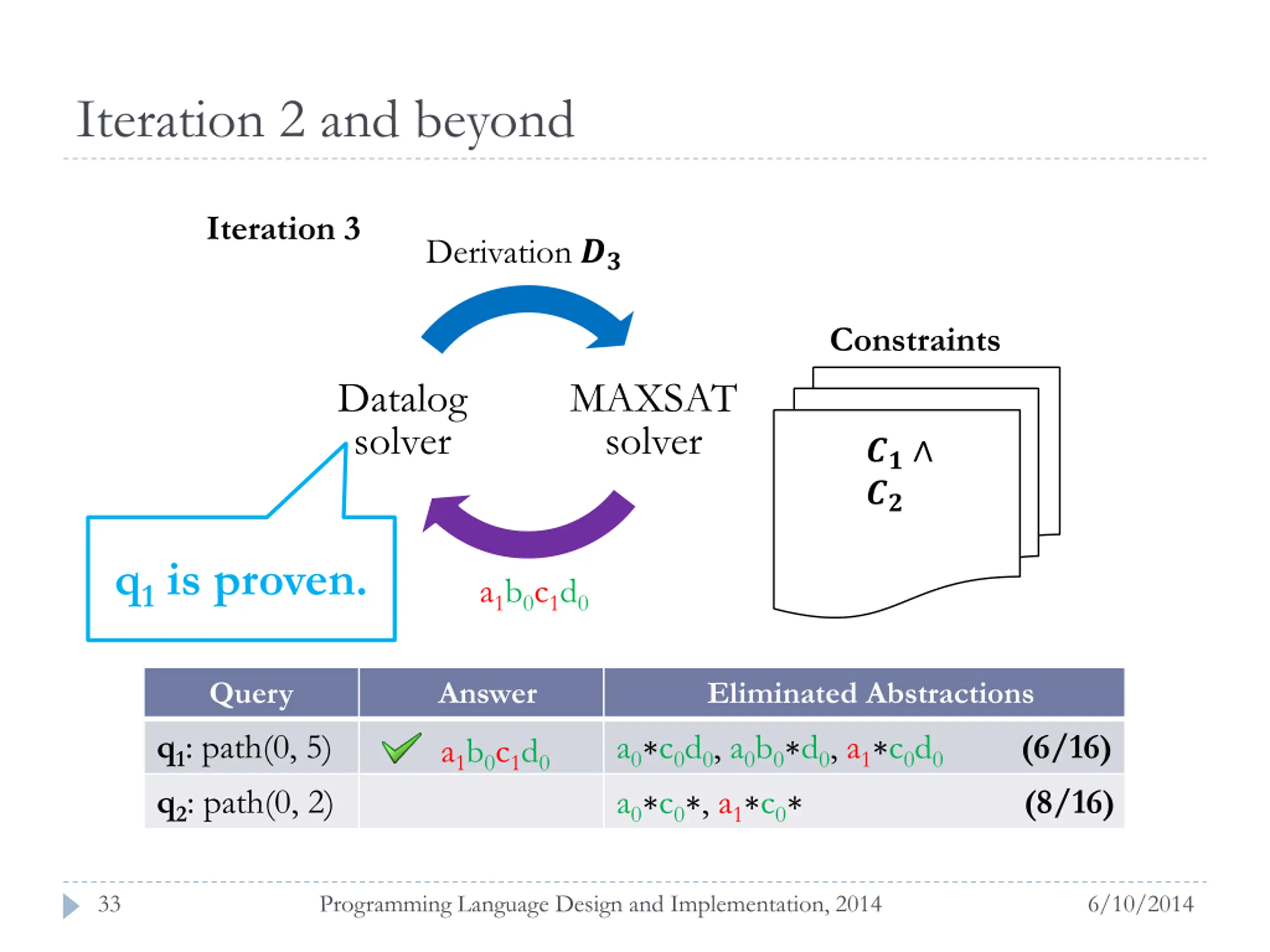 Iteration 2 and beyond Iteration 2 Derivation ?? Constraints Datalog solver MAXSAT solver ?? ?? ?? a1b0c1d0 Query Answer Eliminated Abstractions a0 c0d0, a0b0 d0, a1 c0d0 (6/16) a0 c0 , a1 c0 (8/16) q1: path(0, 5) q2: path(0, 2) 32 Programming Language Design and Implementation, 2014 6/10/2014