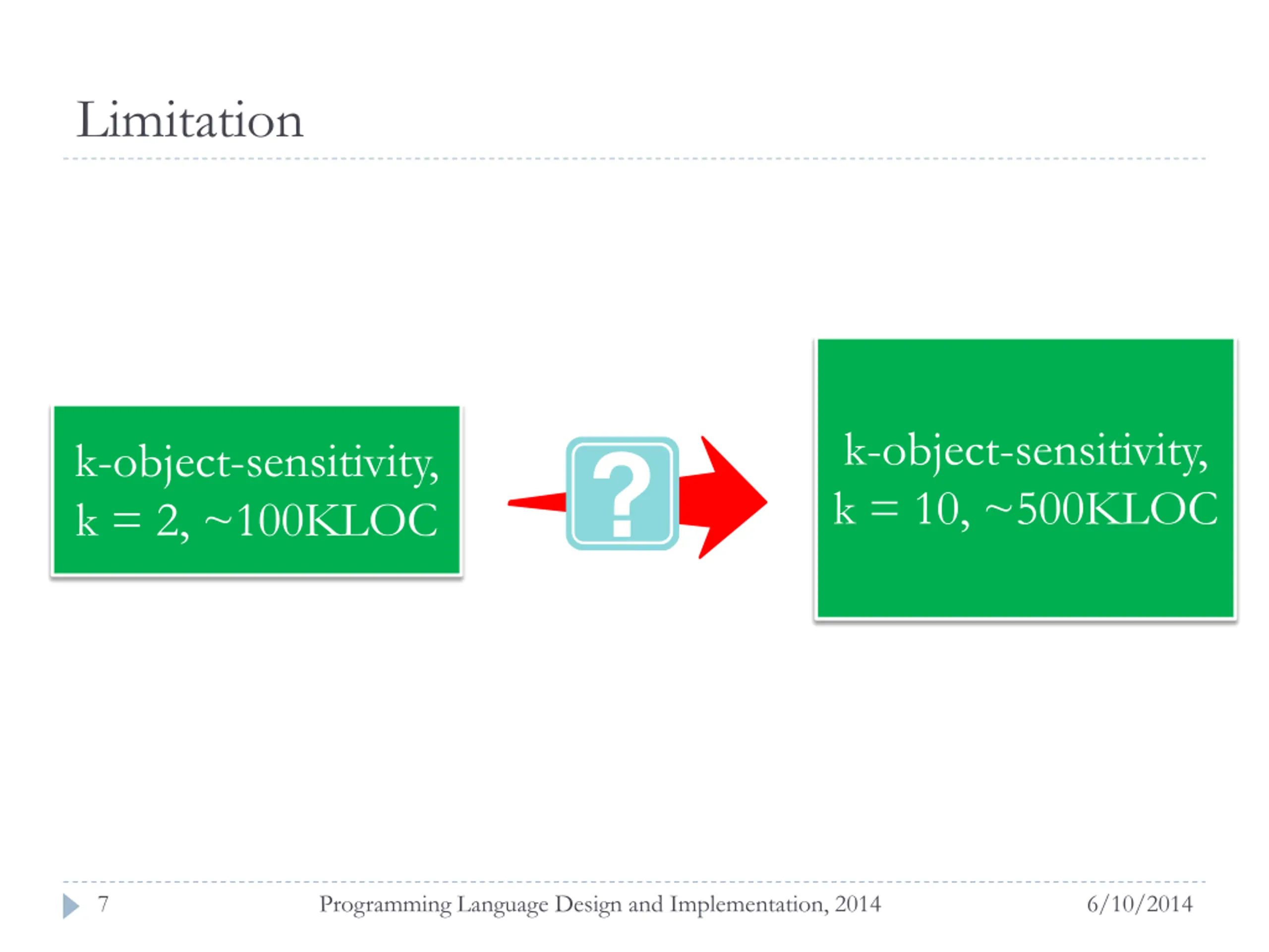 Limitation k-object-sensitivity, k = 10, ~500KLOC k-object-sensitivity, k = 2, ~100KLOC 7 Programming Language Design and Implementation, 2014 6/10/2014