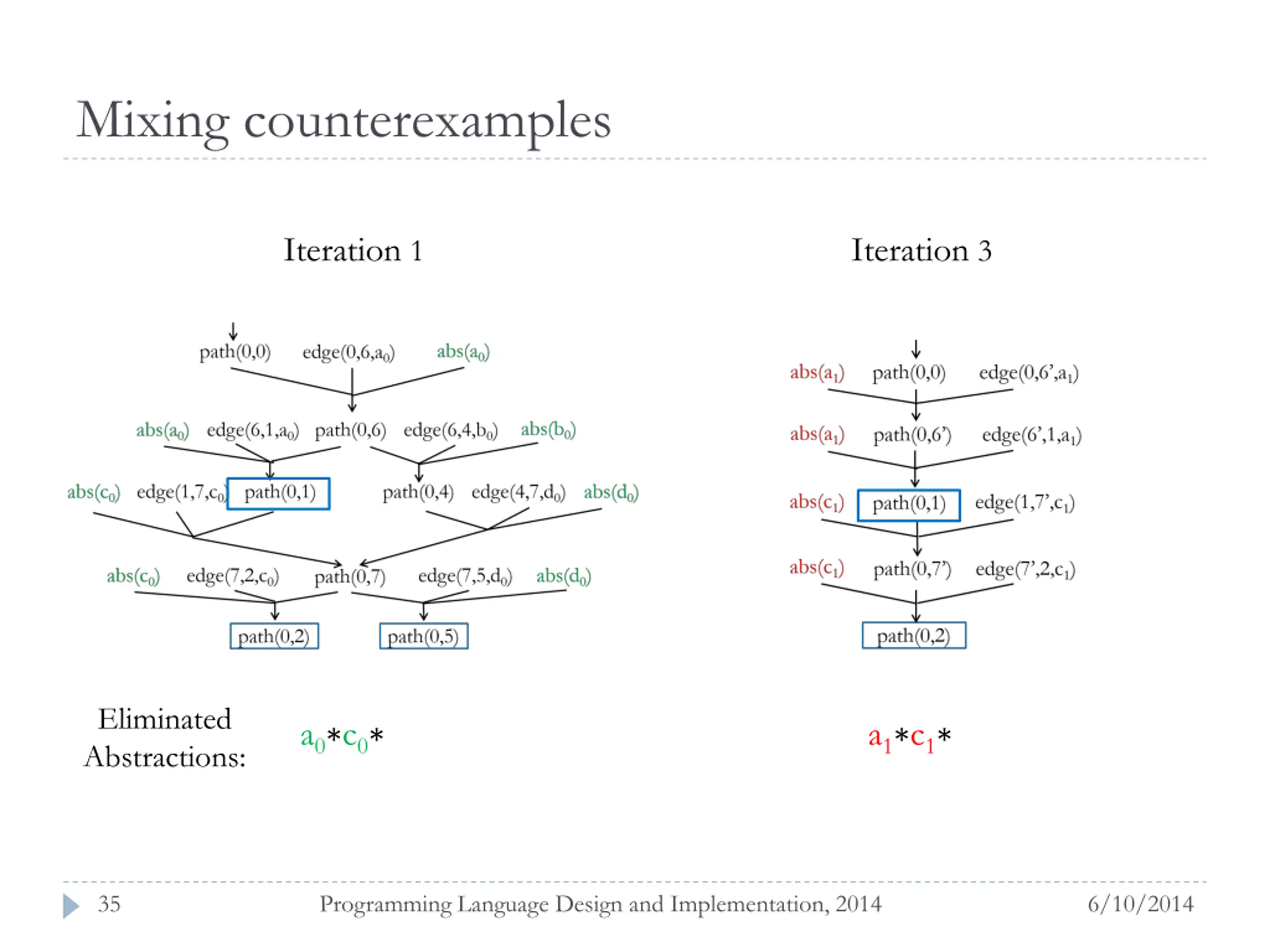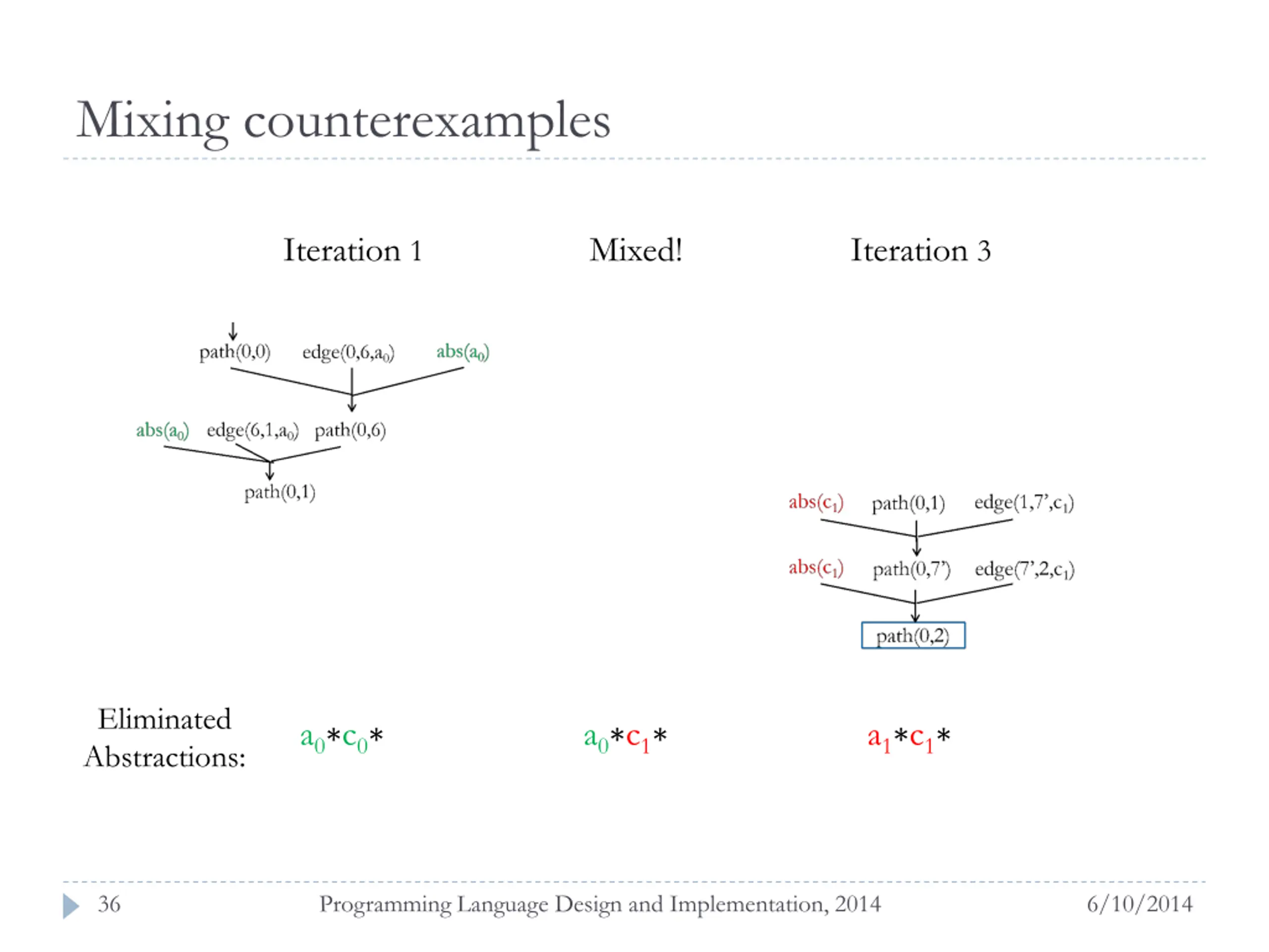 Mixing counterexamples Iteration 1 Iteration 3 Eliminated Abstractions: a0 c0 a1 c1 35 Programming Language Design and Implementation, 2014 6/10/2014