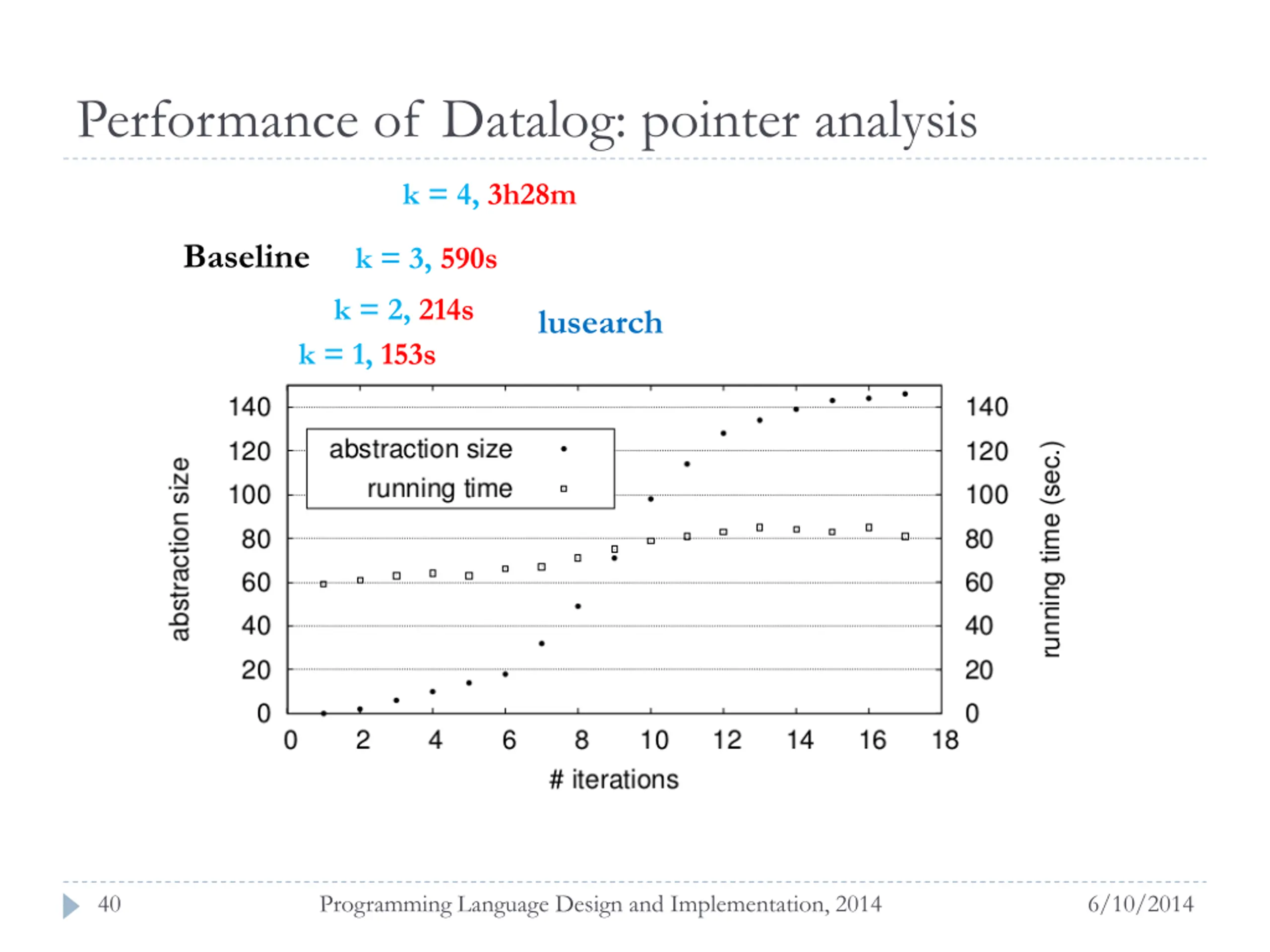 Performance of Datalog: pointer analysis k = 4, 3h28m Baseline k = 3, 590s k = 2, 214s lusearch k = 1, 153s 40 Programming Language Design and Implementation, 2014 6/10/2014