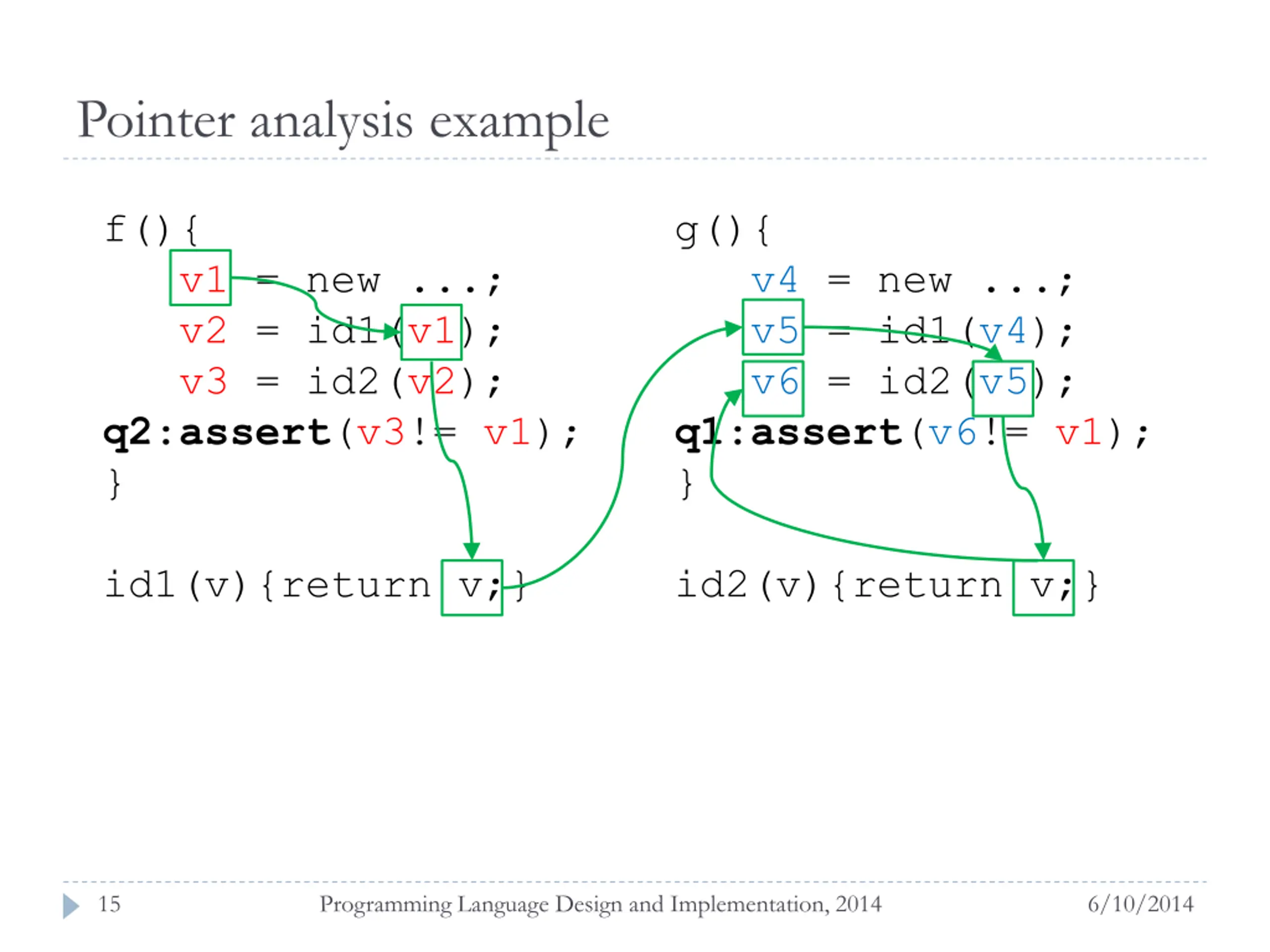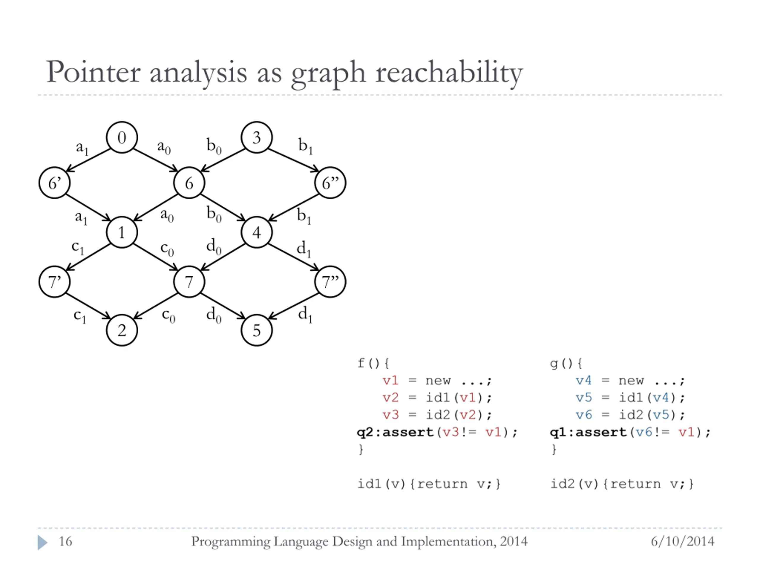 Pointer analysis example f(){ v2 = id1(v1); v3 = id2(v2); q2:assert(v3!= v1); } g(){ v5 = id1(v4); v6 = id2(v5); q1:assert(v6!= v1); } v1 = new ...; v4 = new ...; id1(v){return v;} id2(v){return v;} 15 Programming Language Design and Implementation, 2014 6/10/2014