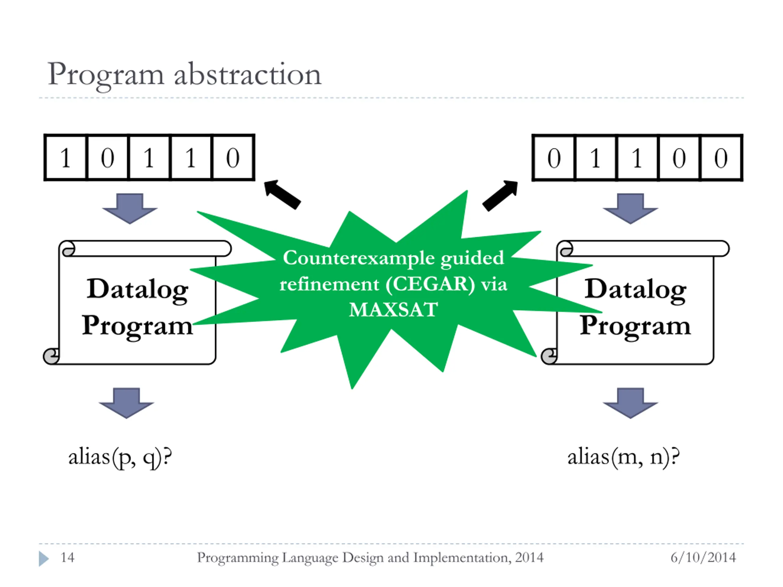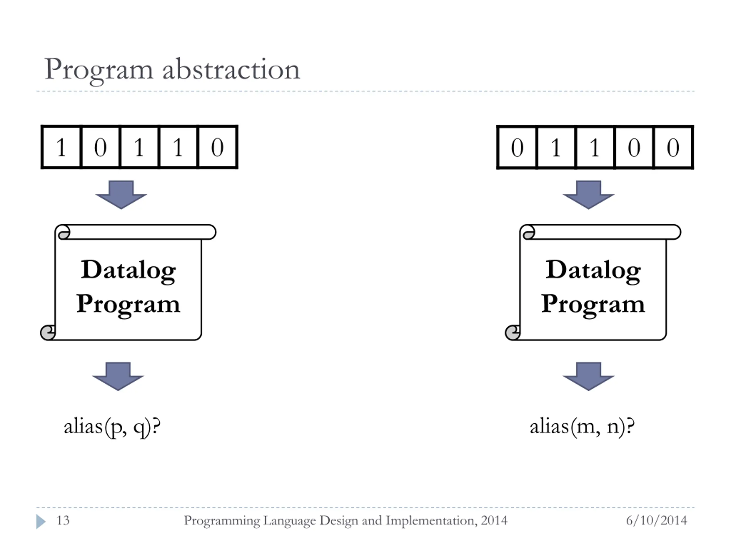 Program abstraction 1 0 1 1 0 0 1 1 0 0 Datalog Program Datalog Program alias(p, q)? alias(m, n)? 13 Programming Language Design and Implementation, 2014 6/10/2014