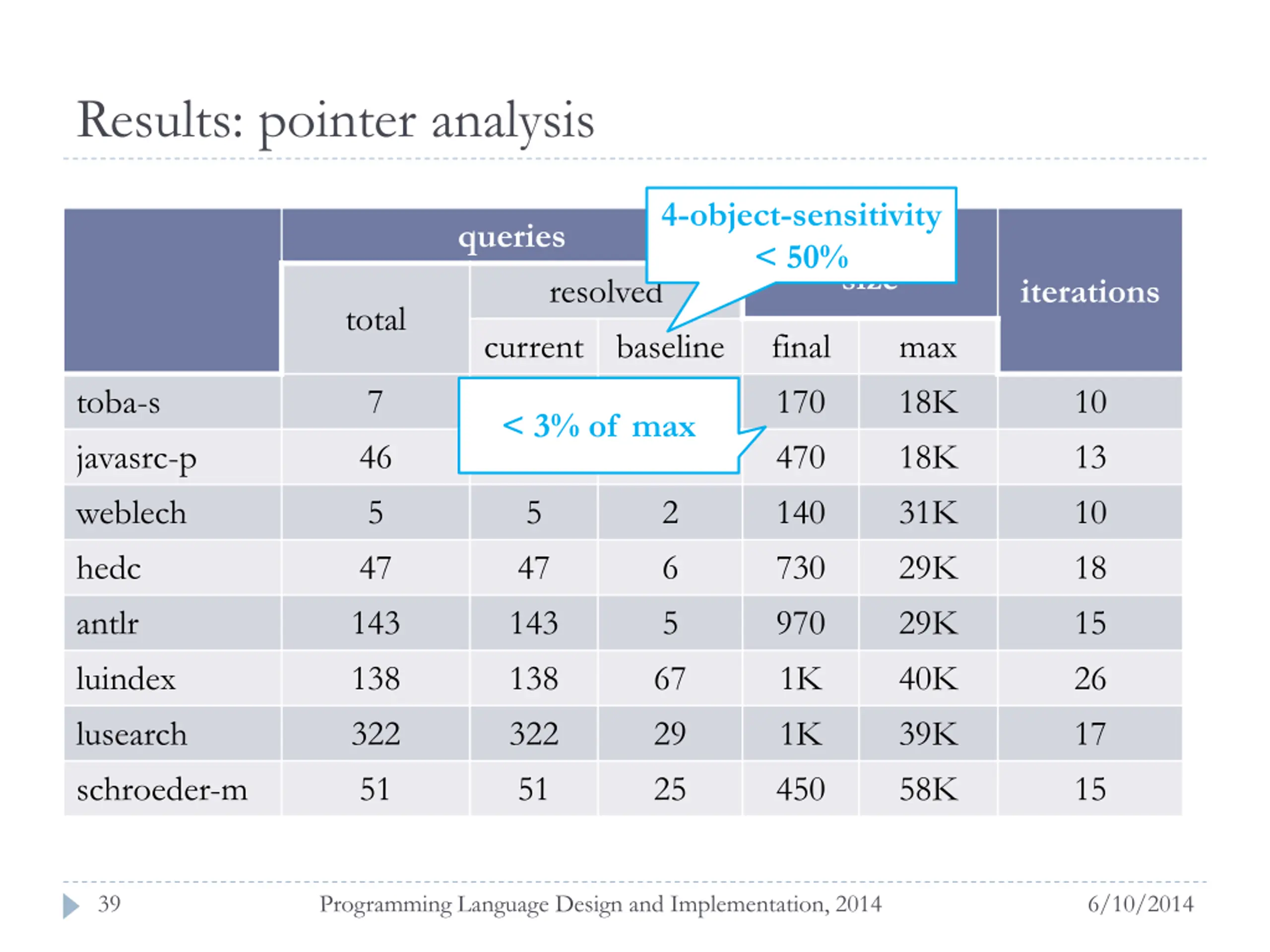 Results: pointer analysis 4-object-sensitivity < 50% queries abstraction size resolved iterations total current 7 46 5 47 143 138 322 51 baseline 0 0 2 6 5 67 29 25 final 170 470 140 730 970 1K 1K 450 max 18K 18K 31K 29K 29K 40K 39K 58K toba-s javasrc-p weblech hedc antlr luindex lusearch schroeder-m 7 46 5 47 143 138 322 51 10 13 10 18 15 26 17 15 < 3% of max 39 Programming Language Design and Implementation, 2014 6/10/2014