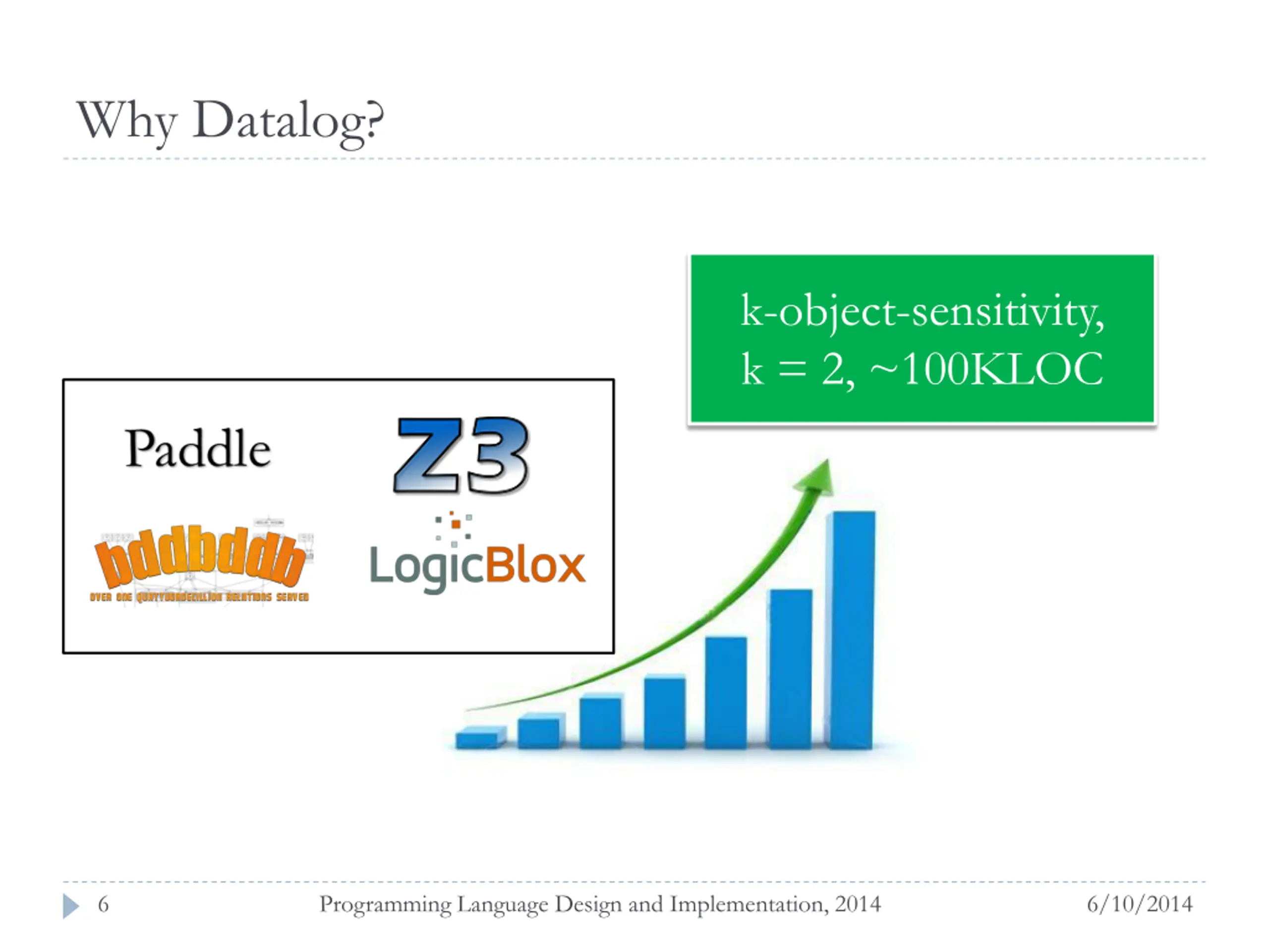 Why Datalog? k-object-sensitivity, k = 2, ~100KLOC 6 Programming Language Design and Implementation, 2014 6/10/2014