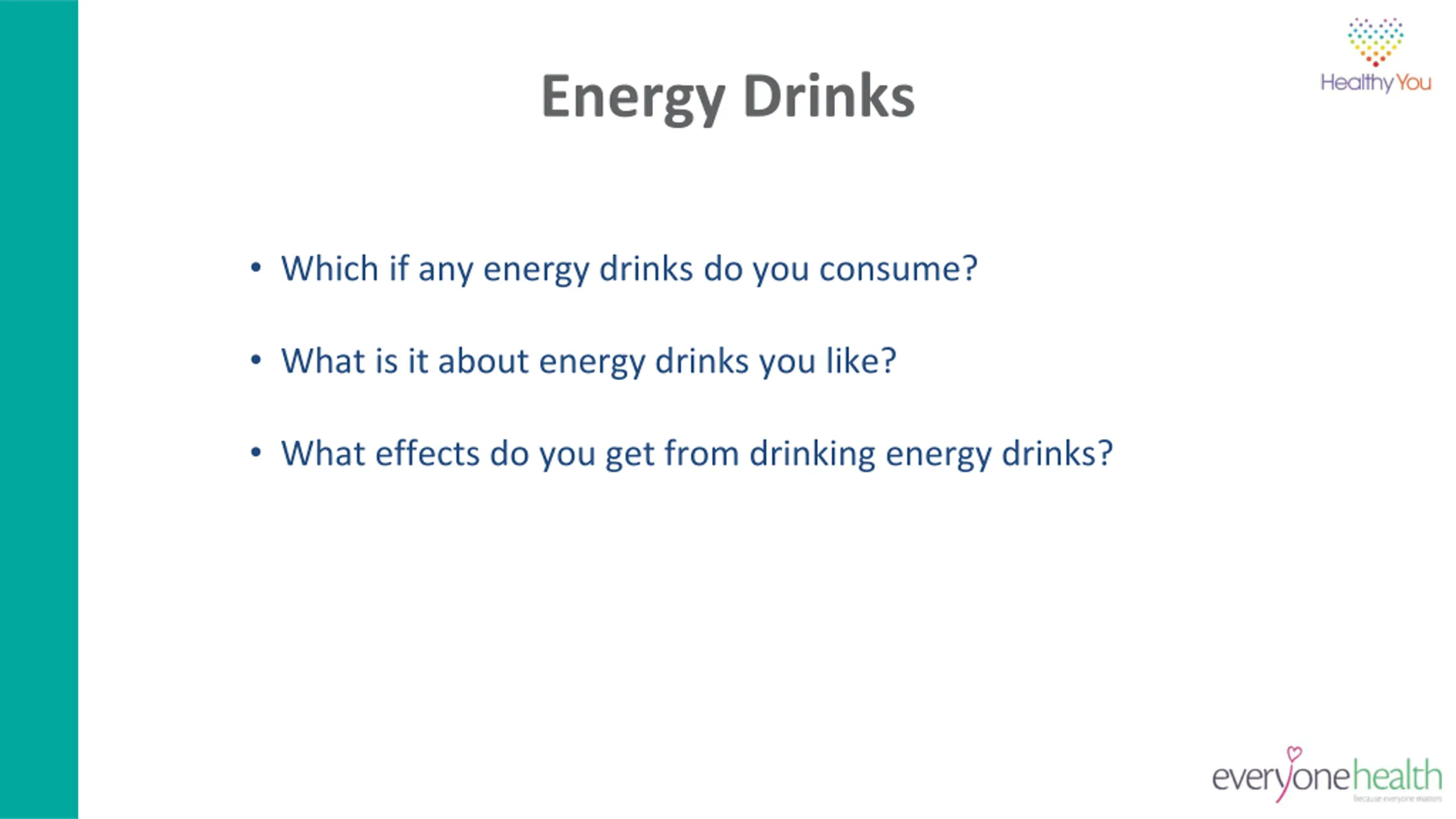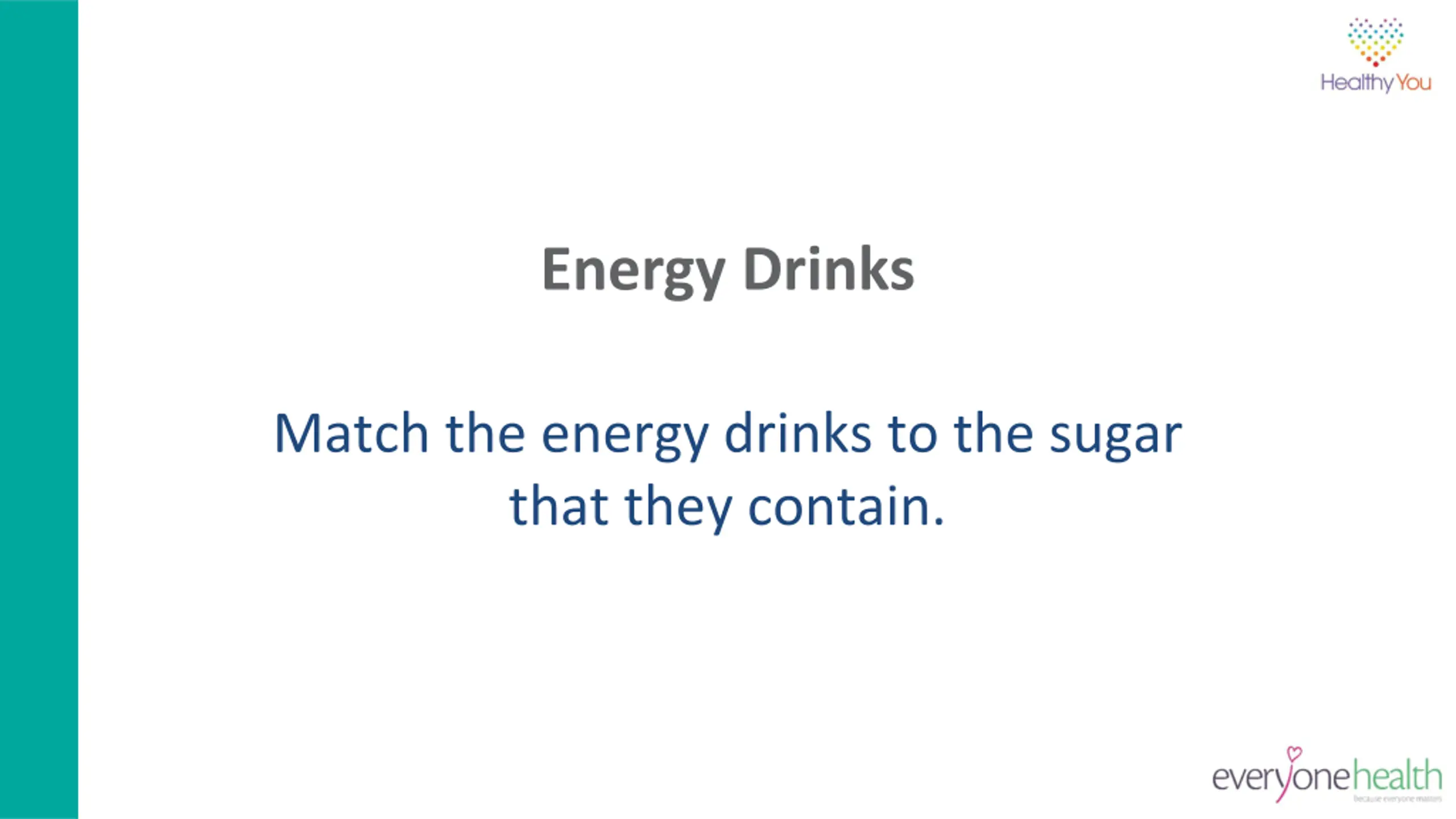 Learning outcomes: To understand the role of fluids within the human body. To be aware of the sugar contained in some drinks. To be aware of the amount of caffeine and sugar found in energy drinks. To understand possible health risks associated with increased levels of sugar and caffeine.