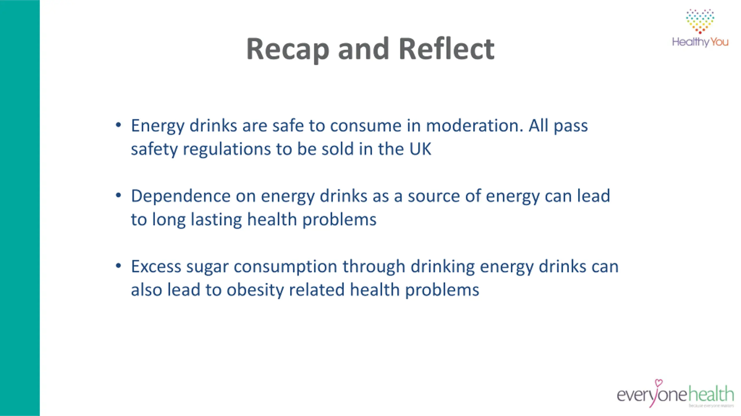 Recap and Reflect Energy drinks are safe to consume in moderation. All pass safety regulations to be sold in the UK Dependence on energy drinks as a source of energy can lead to long lasting health problems Excess sugar consumption through drinking energy drinks can also lead to obesity related health problems