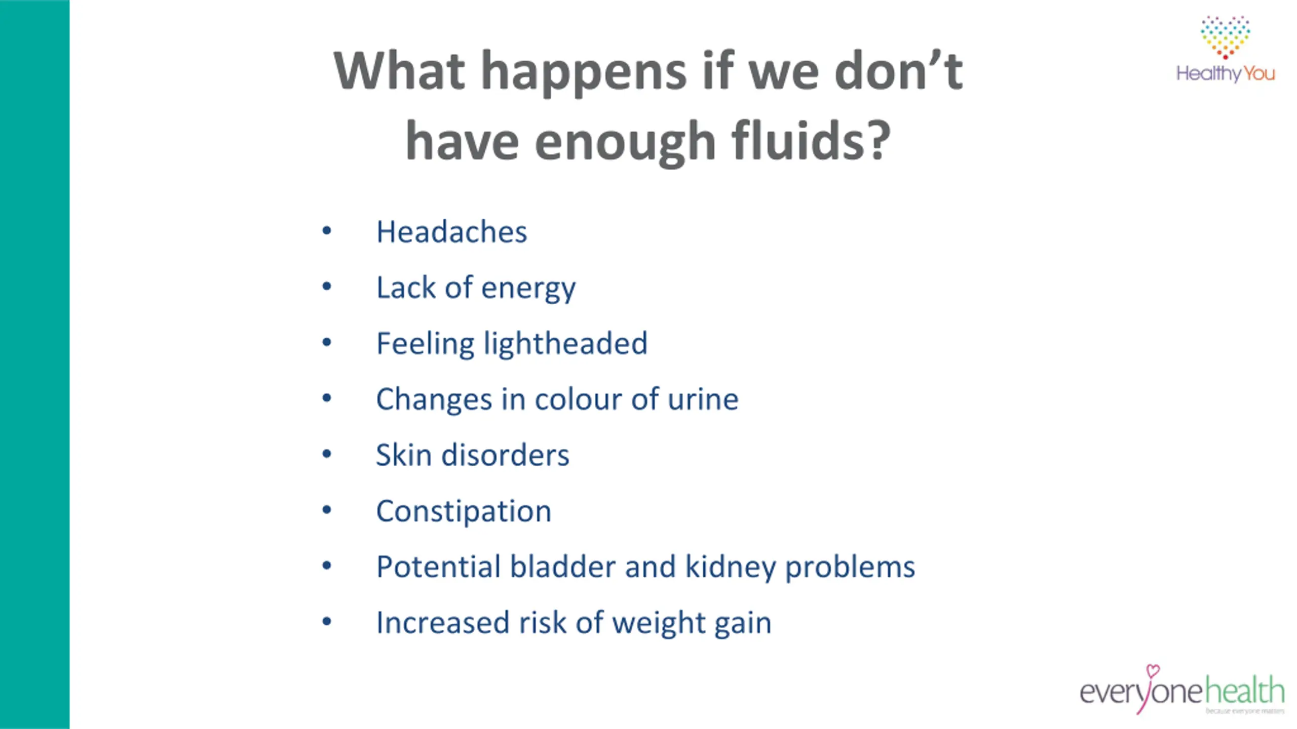 What happens if we dont have enough fluids? Headaches Lack of energy Feeling lightheaded Changes in colour of urine Skin disorders Constipation Potential bladder and kidney problems Increased risk of weight gain
