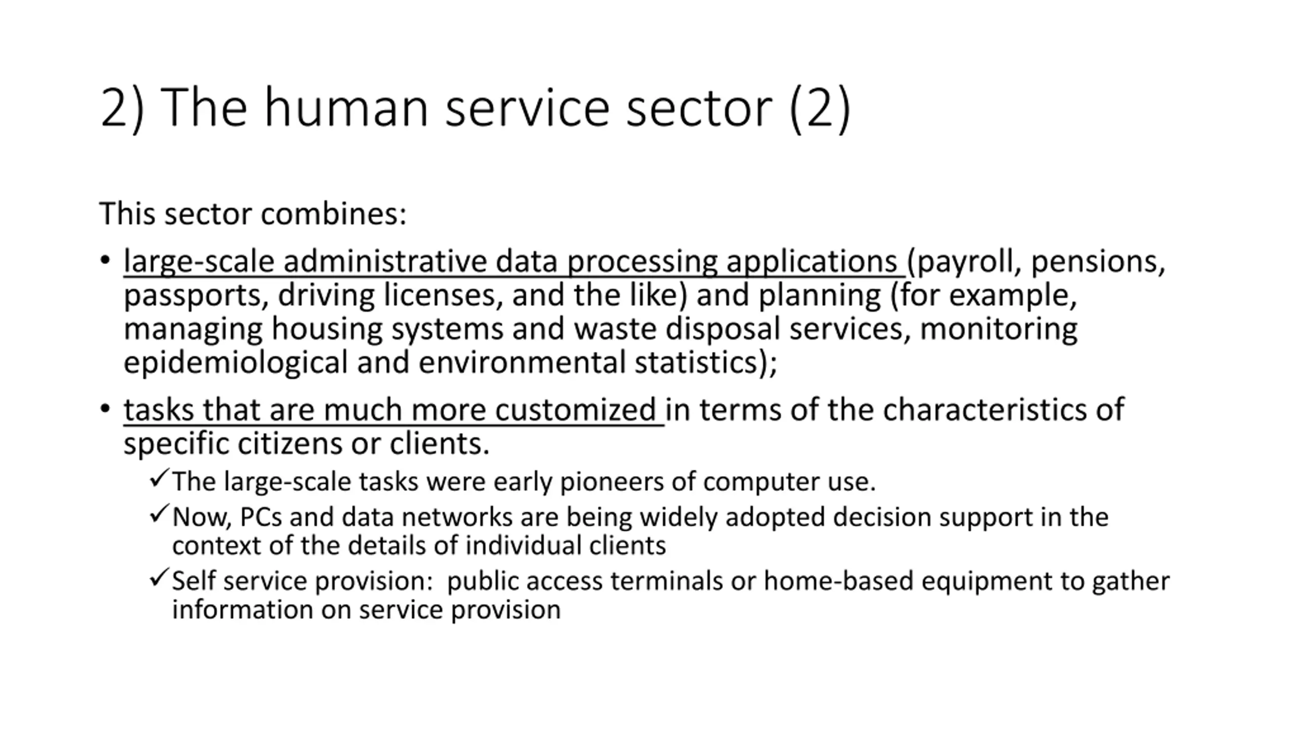 2) The human service sector (2) This sector combines: large-scale administrative data processing applications (payroll, pensions, passports, driving licenses, and the like) and planning (for example, managing housing systems and waste disposal services, monitoring epidemiological and environmental statistics); tasks that are much more customized in terms of the characteristics of specific citizens or clients. The large-scale tasks were early pioneers of computer use. Now, PCs and data networks are being widely adopted decision support in the context of the details of individual clients Self service provision: public access terminals or home-based equipment to gather information on service provision