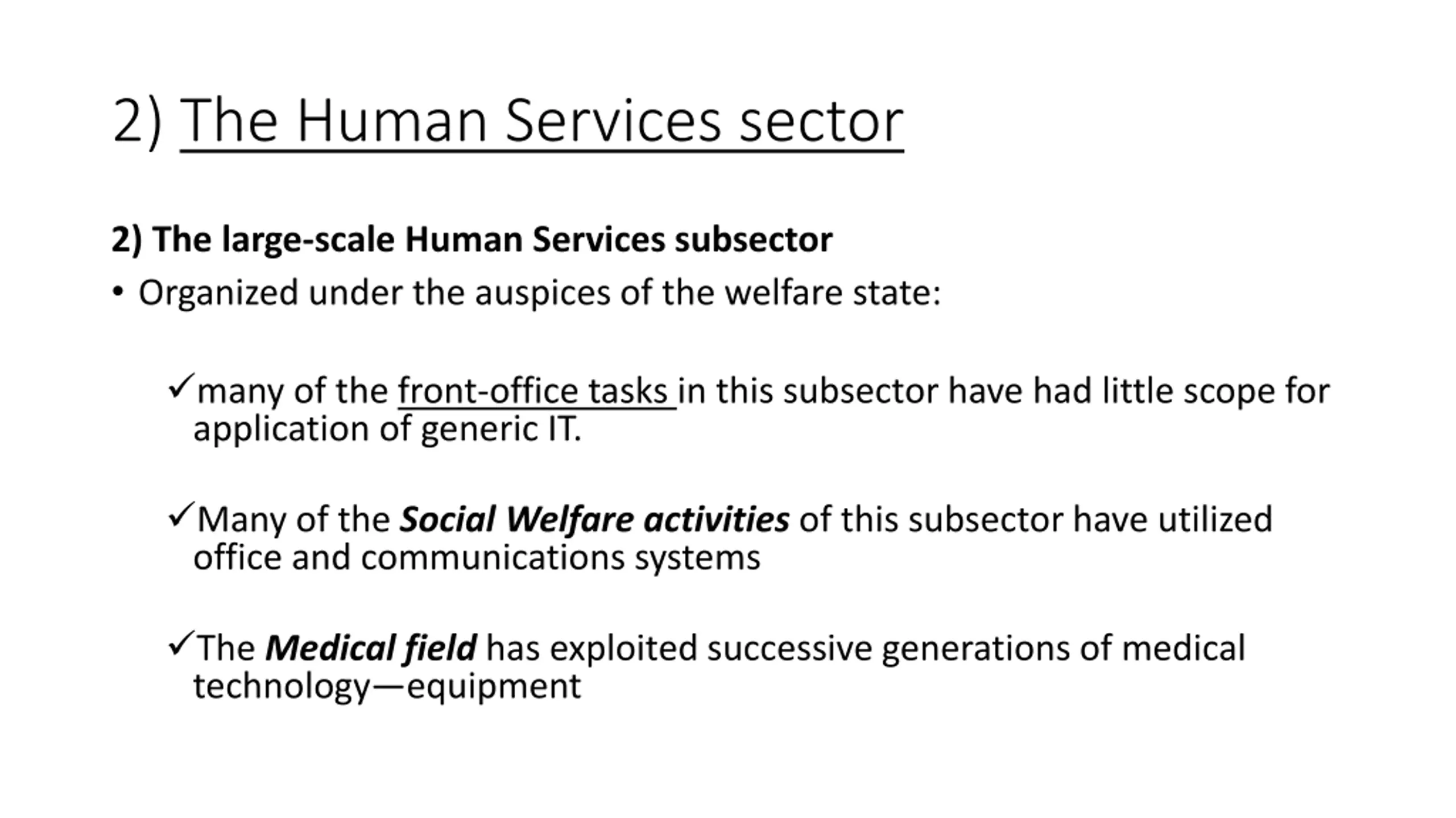 2) The Human Services sector 2) The large-scale Human Services subsector Organized under the auspices of the welfare state: many of the front-office tasks in this subsector have had little scope for application of generic IT. Many of the Social Welfare activities of this subsector have utilized office and communications systems The Medical field has exploited successive generations of medical technology equipment