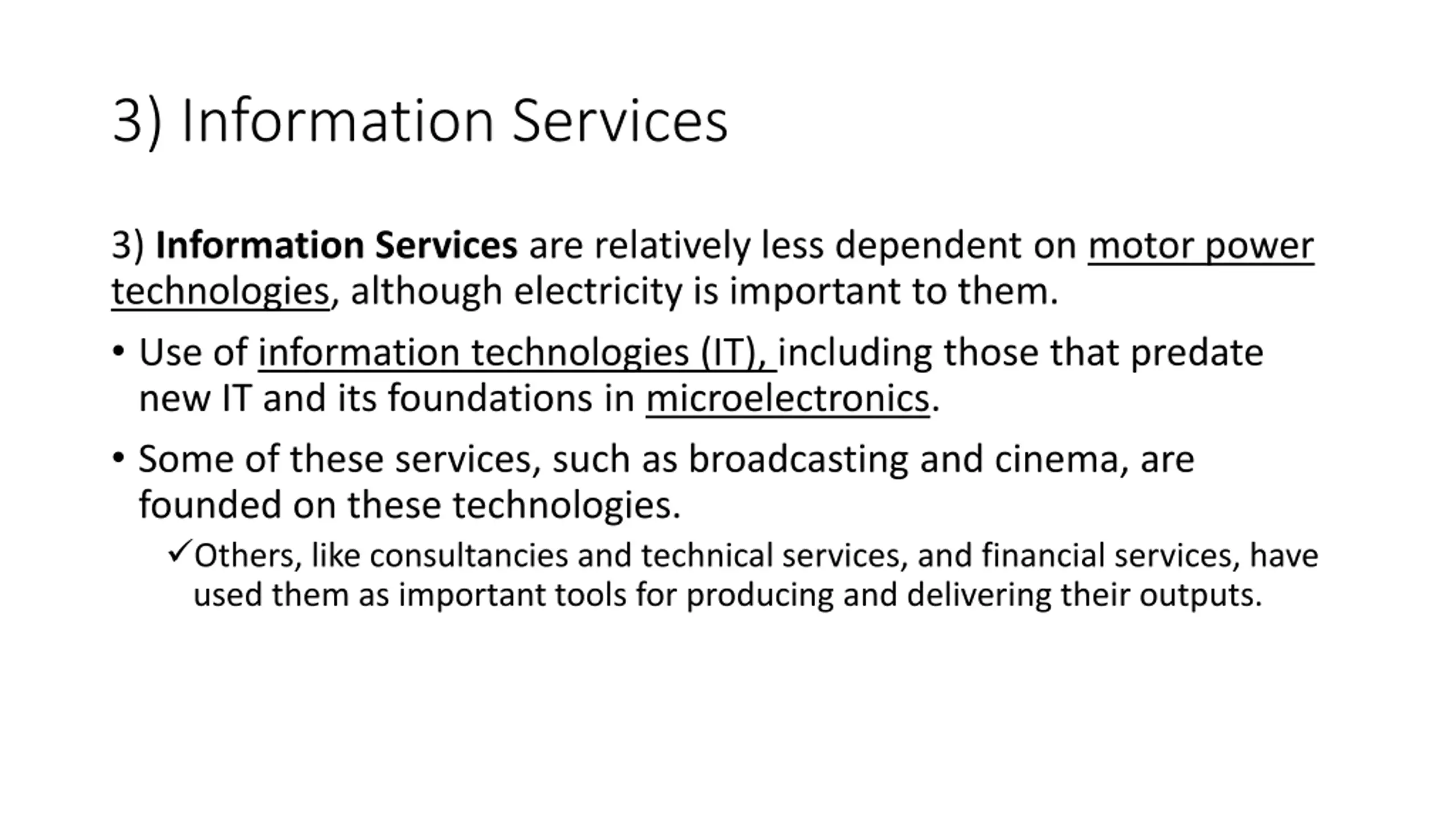 3) Information Services 3) Information Services are relatively less dependent on motor power technologies, although electricity is important to them. Use of information technologies (IT), including those that predate new IT and its foundations in microelectronics. Some of these services, such as broadcasting and cinema, are founded on these technologies. Others, like consultancies and technical services, and financial services, have used them as important tools for producing and delivering their outputs.
