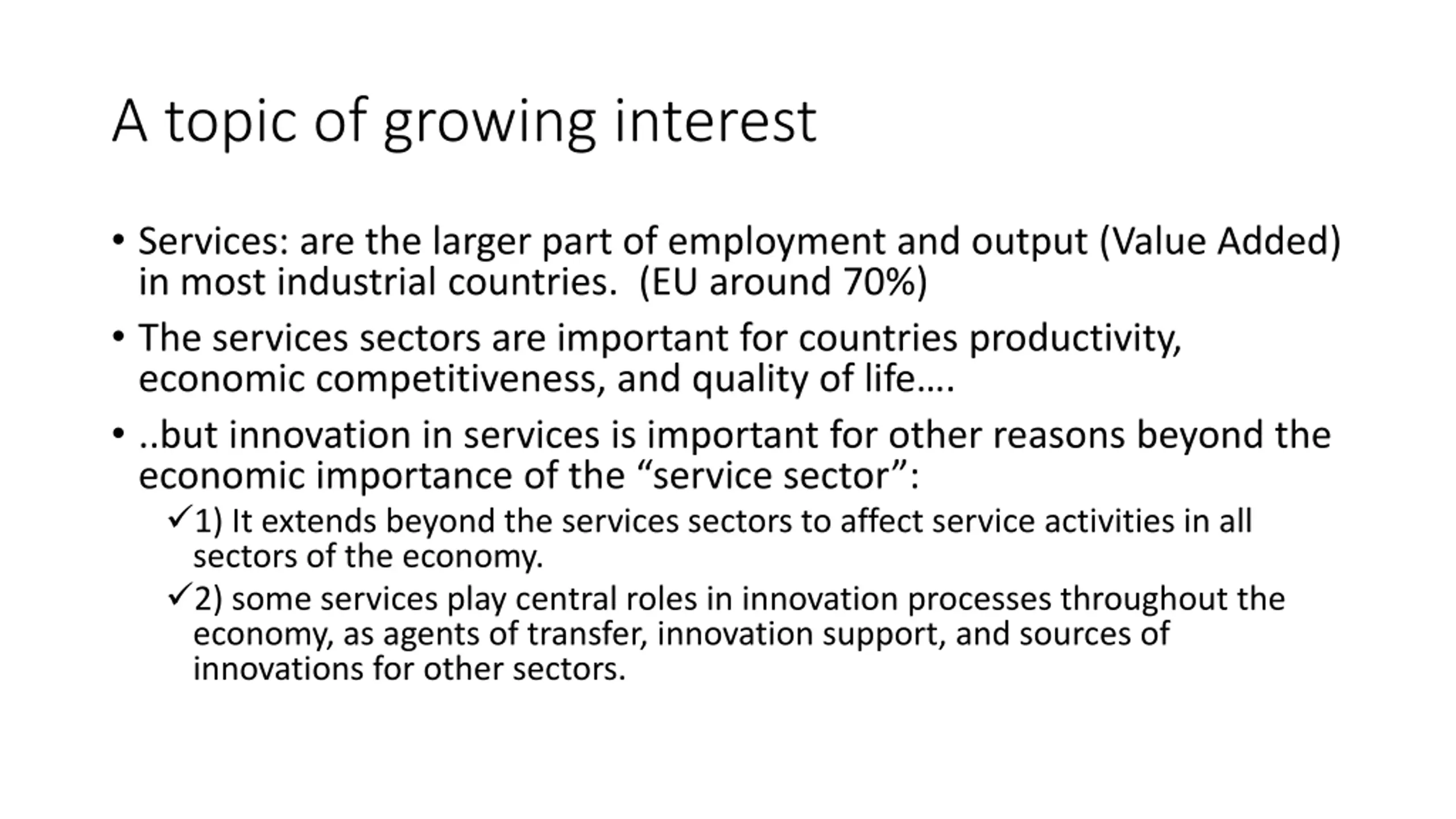 A topic of growing interest Services: are the larger part of employment and output (Value Added) in most industrial countries. (EU around 70%) The services sectors are important for countries productivity, economic competitiveness, and quality of life . ..but innovation in services is important for other reasons beyond the economic importance of the service sector : 1) It extends beyond the services sectors to affect service activities in all sectors of the economy. 2) some services play central roles in innovation processes throughout the economy, as agents of transfer, innovation support, and sources of innovations for other sectors.