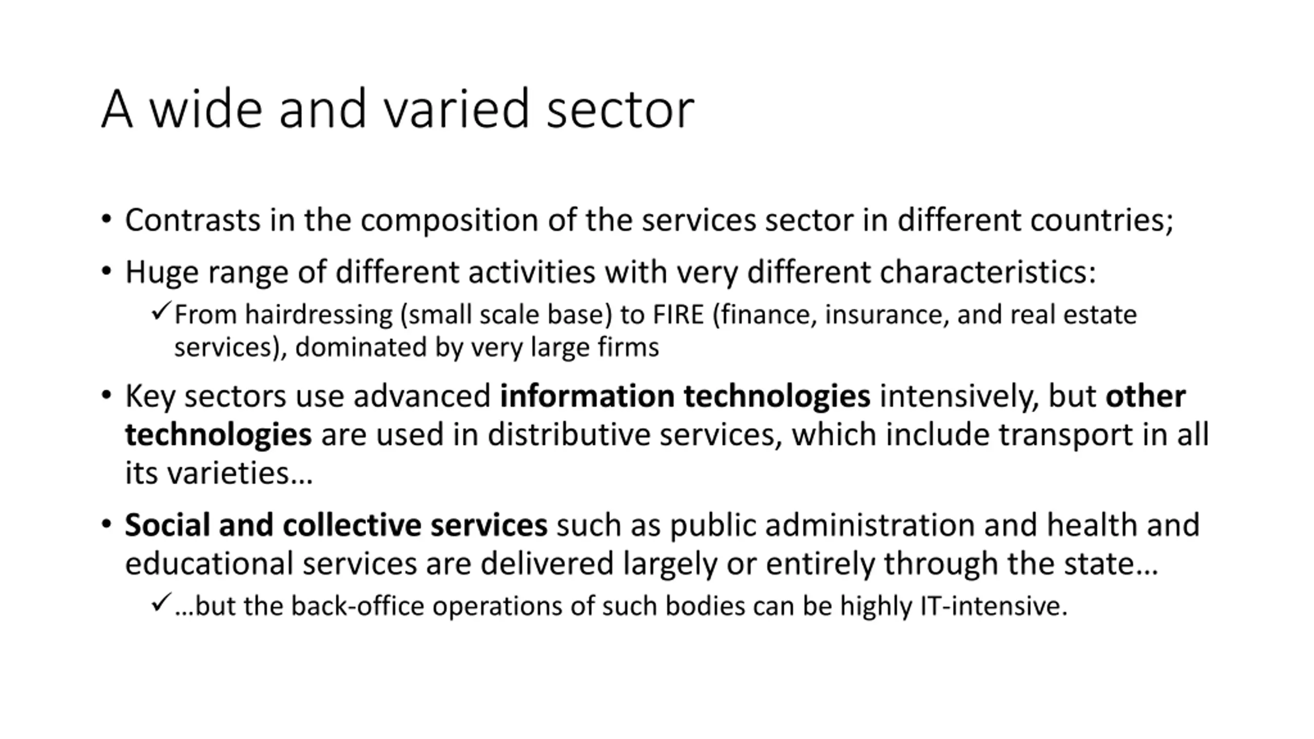 A wide and varied sector Contrasts in the composition of the services sector in different countries; Huge range of different activities with very different characteristics: From hairdressing (small scale base) to FIRE (finance, insurance, and real estate services), dominated by very large firms Key sectors use advanced information technologies intensively, but other technologies are used in distributive services, which include transport in all its varieties Social and collective services such as public administration and health and educational services are delivered largely or entirely through the state but the back-office operations of such bodies can be highly IT-intensive.