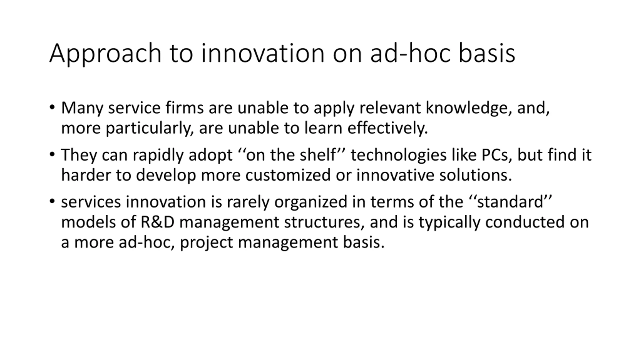 Approach to innovation on ad-hoc basis Many service firms are unable to apply relevant knowledge, and, more particularly, are unable to learn effectively. They can rapidly adopt on the shelf technologies like PCs, but find it harder to develop more customized or innovative solutions. services innovation is rarely organized in terms of the standard models of R&D management structures, and is typically conducted on a more ad-hoc, project management basis.