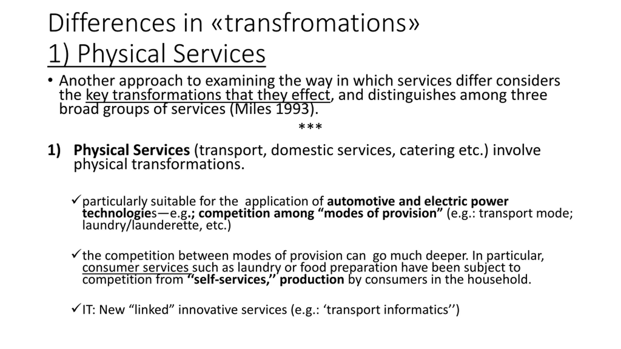 Differences in transfromations 1) Physical Services Another approach to examining the way in which services differ considers the key transformations that they effect, and distinguishes among three broad groups of services (Miles 1993). *** 1) Physical Services (transport, domestic services, catering etc.) involve physical transformations. particularly suitable for the application of automotive and electric power technologies e.g.; competition among modes of provision (e.g.: transport mode; laundry/launderette, etc.) the competition between modes of provision can go much deeper. In particular, consumer services such as laundry or food preparation have been subject to competition from self-services, production by consumers in the household. IT: New linked innovative services (e.g.: transport informatics )