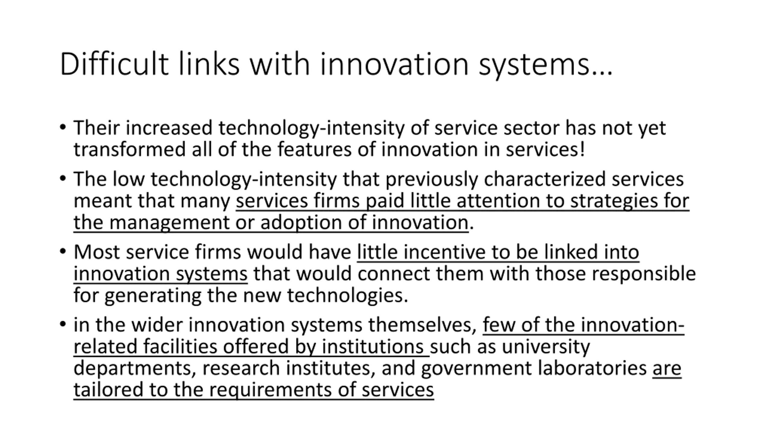 Difficult links with innovation systems Their increased technology-intensity of service sector has not yet transformed all of the features of innovation in services! The low technology-intensity that previously characterized services meant that many services firms paid little attention to strategies for the management or adoption of innovation. Most service firms would have little incentive to be linked into innovation systems that would connect them with those responsible for generating the new technologies. in the wider innovation systems themselves, few of the innovation- related facilities offered by institutions such as university departments, research institutes, and government laboratories are tailored to the requirements of services