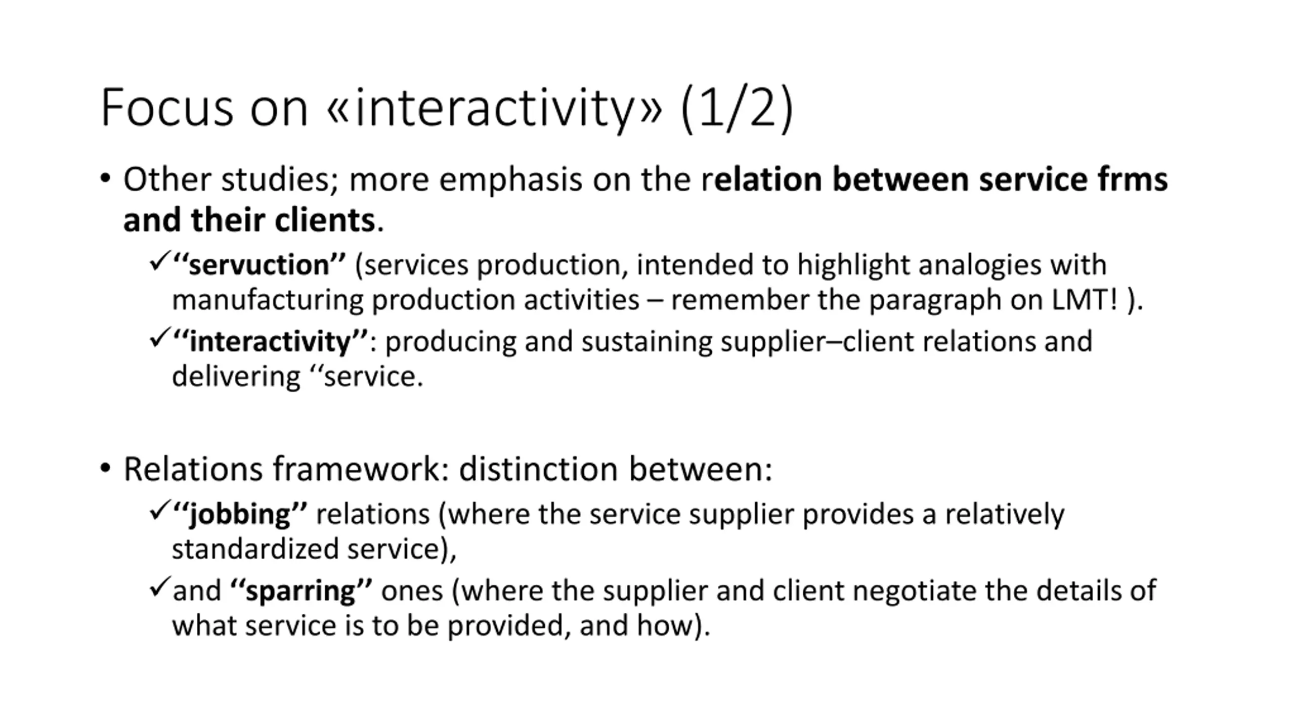 Focus on interactivity (1/2) Other studies; more emphasis on the relation between service frms and their clients. servuction (services production, intended to highlight analogies with manufacturing production activities remember the paragraph on LMT! ). interactivity : producing and sustaining supplier client relations and delivering service. Relations framework: distinction between: jobbing relations (where the service supplier provides a relatively standardized service), and sparring ones (where the supplier and client negotiate the details of what service is to be provided, and how).