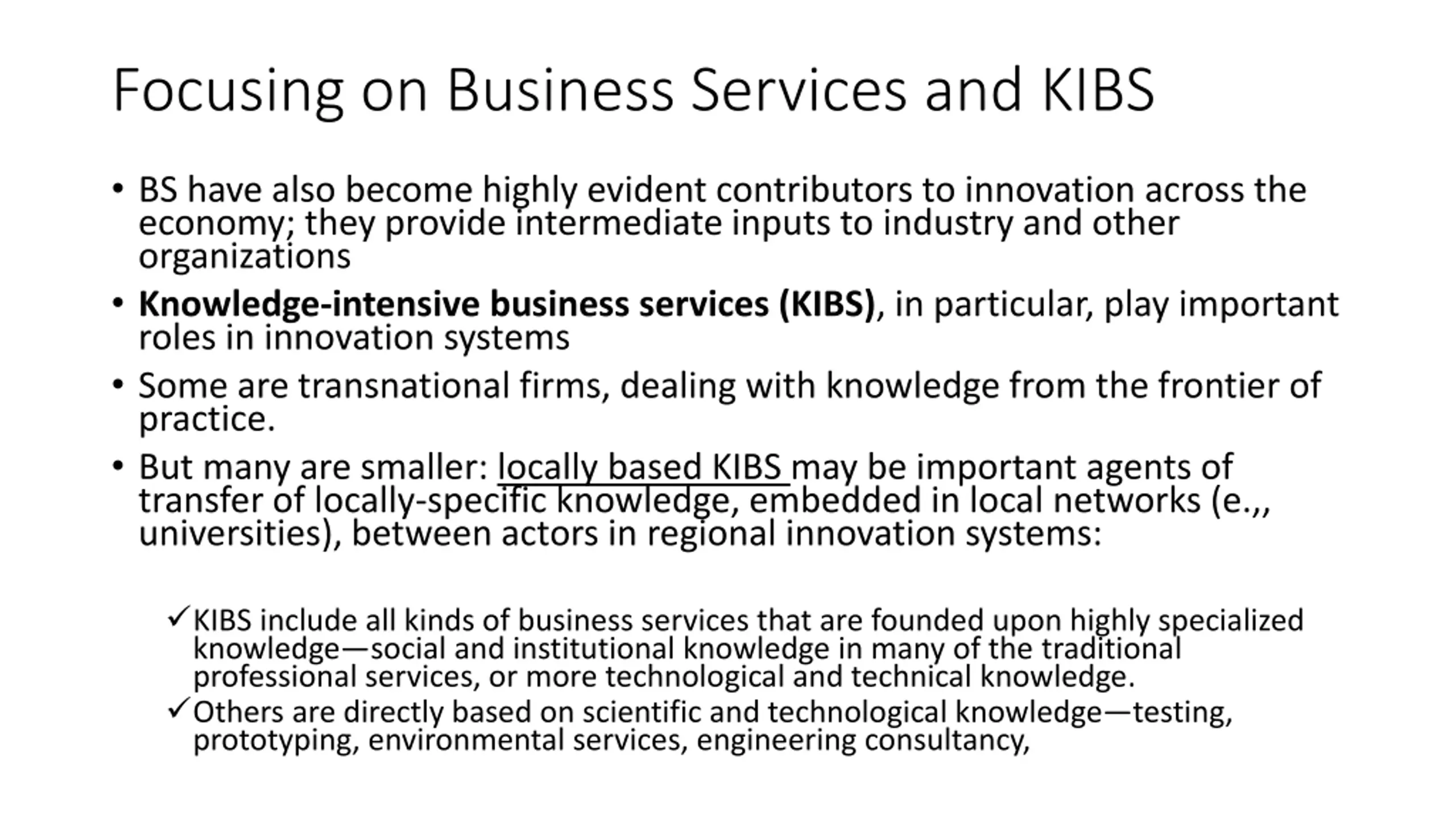 Focusing on Business Services and KIBS BS have also become highly evident contributors to innovation across the economy; they provide intermediate inputs to industry and other organizations Knowledge-intensive business services (KIBS), in particular, play important roles in innovation systems Some are transnational firms, dealing with knowledge from the frontier of practice. But many are smaller: locally based KIBS may be important agents of transfer of locally-specific knowledge, embedded in local networks (e.,, universities), between actors in regional innovation systems: KIBS include all kinds of business services that are founded upon highly specialized knowledge social and institutional knowledge in many of the traditional professional services, or more technological and technical knowledge. Others are directly based on scientific and technological knowledge testing, prototyping, environmental services, engineering consultancy,