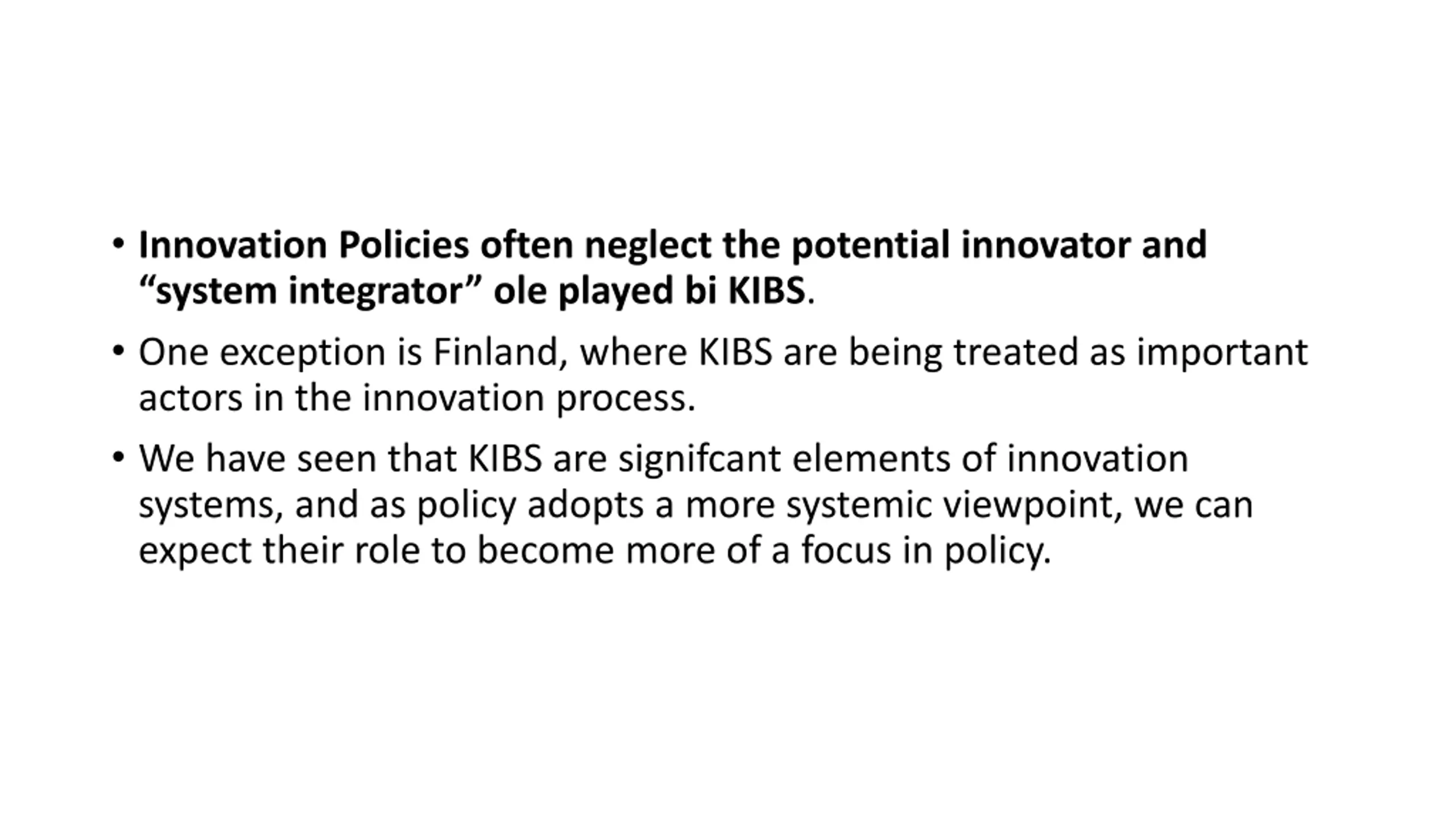 Innovation Policies often neglect the potential innovator and system integrator ole played bi KIBS. One exception is Finland, where KIBS are being treated as important actors in the innovation process. We have seen that KIBS are signifcant elements of innovation systems, and as policy adopts a more systemic viewpoint, we can expect their role to become more of a focus in policy.