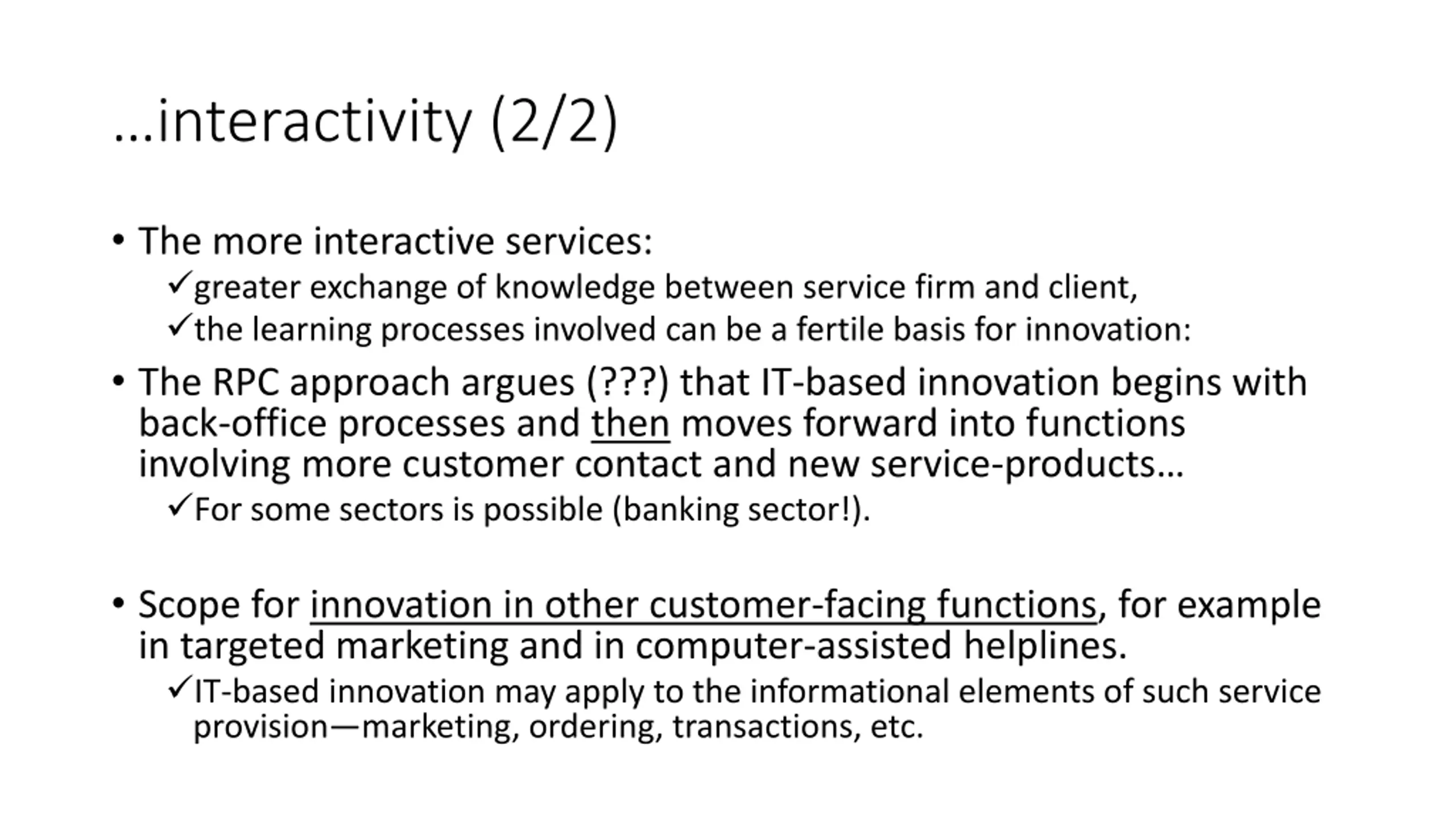 interactivity (2/2) The more interactive services: greater exchange of knowledge between service firm and client, the learning processes involved can be a fertile basis for innovation: The RPC approach argues (???) that IT-based innovation begins with back-office processes and then moves forward into functions involving more customer contact and new service-products For some sectors is possible (banking sector!). Scope for innovation in other customer-facing functions, for example in targeted marketing and in computer-assisted helplines. IT-based innovation may apply to the informational elements of such service provision marketing, ordering, transactions, etc.