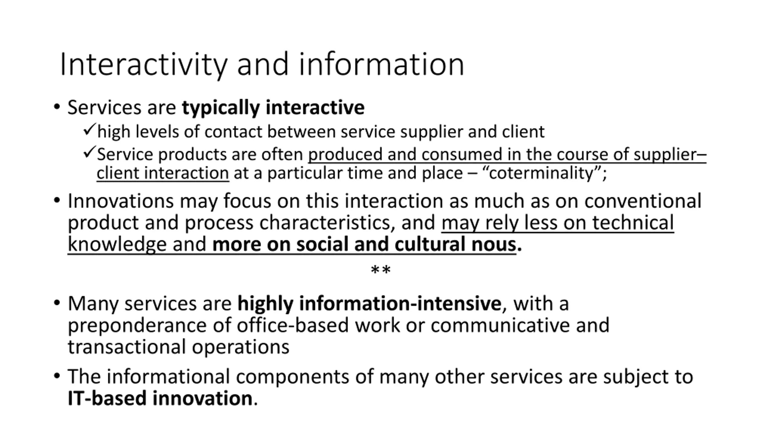 Interactivity and information Services are typically interactive high levels of contact between service supplier and client Service products are often produced and consumed in the course of supplier client interaction at a particular time and place coterminality ; Innovations may focus on this interaction as much as on conventional product and process characteristics, and may rely less on technical knowledge and more on social and cultural nous. ** Many services are highly information-intensive, with a preponderance of office-based work or communicative and transactional operations The informational components of many other services are subject to IT-based innovation.