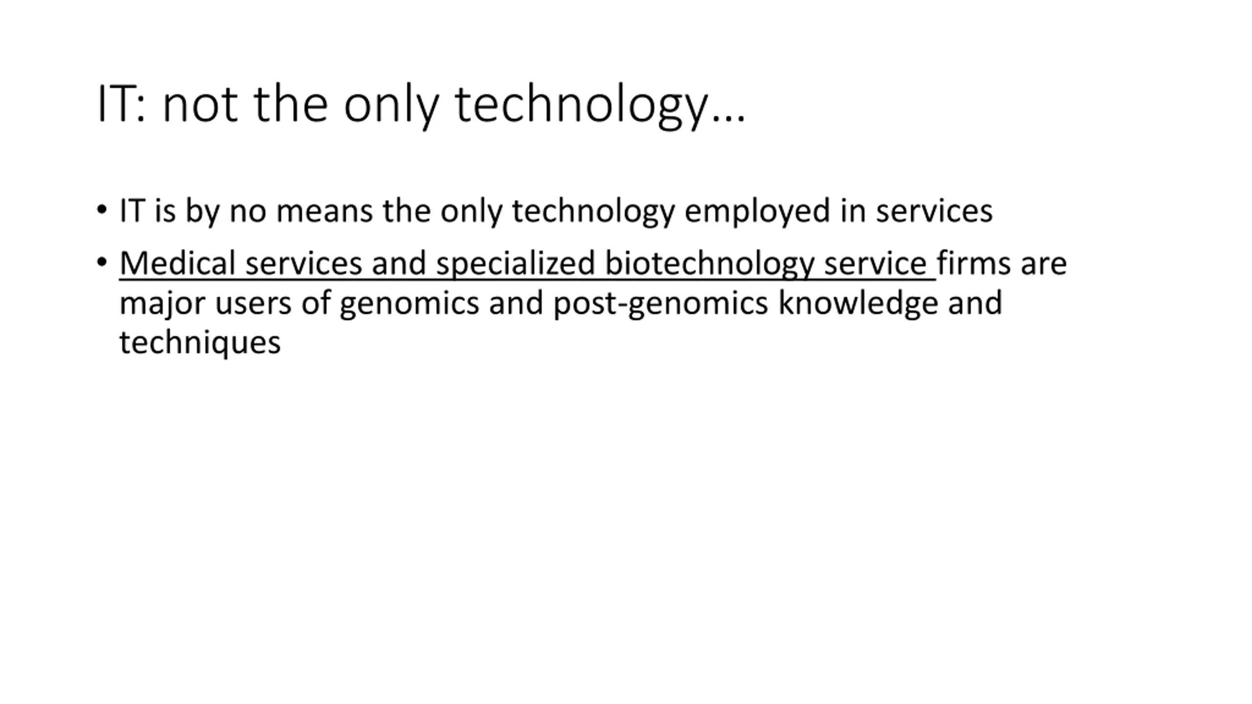 IT: not the only technology IT is by no means the only technology employed in services Medical services and specialized biotechnology service firms are major users of genomics and post-genomics knowledge and techniques