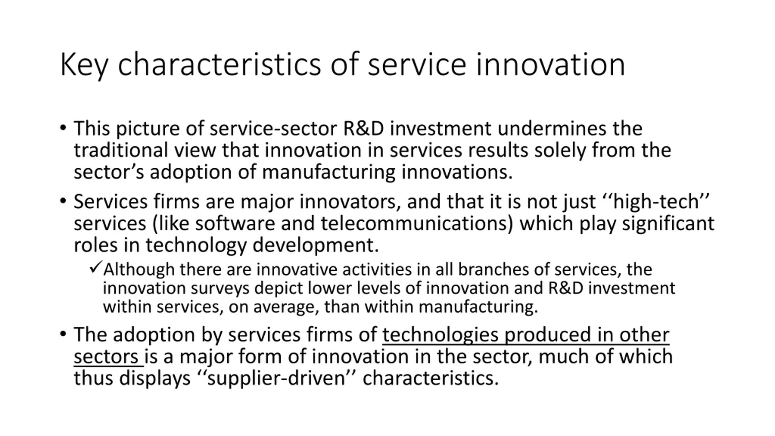 Key characteristics of service innovation This picture of service-sector R&D investment undermines the traditional view that innovation in services results solely from the sector s adoption of manufacturing innovations. Services firms are major innovators, and that it is not just high-tech services (like software and telecommunications) which play significant roles in technology development. Although there are innovative activities in all branches of services, the innovation surveys depict lower levels of innovation and R&D investment within services, on average, than within manufacturing. The adoption by services firms of technologies produced in other sectors is a major form of innovation in the sector, much of which thus displays supplier-driven characteristics.