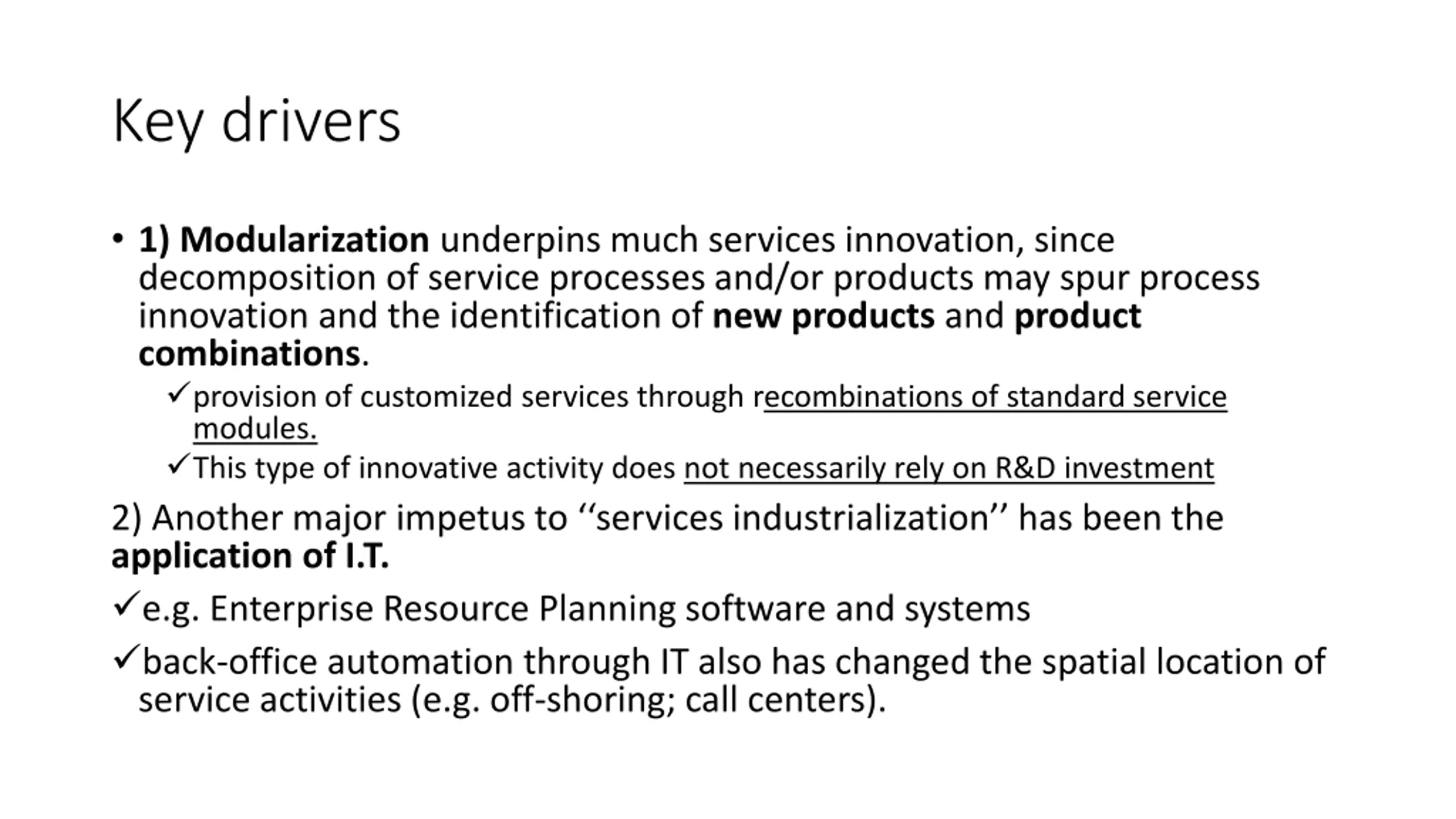 Key drivers 1) Modularization underpins much services innovation, since decomposition of service processes and/or products may spur process innovation and the identification of new products and product combinations. provision of customized services through recombinations of standard service modules. This type of innovative activity does not necessarily rely on R&D investment 2) Another major impetus to services industrialization has been the application of I.T. e.g. Enterprise Resource Planning software and systems back-office automation through IT also has changed the spatial location of service activities (e.g. off-shoring; call centers).