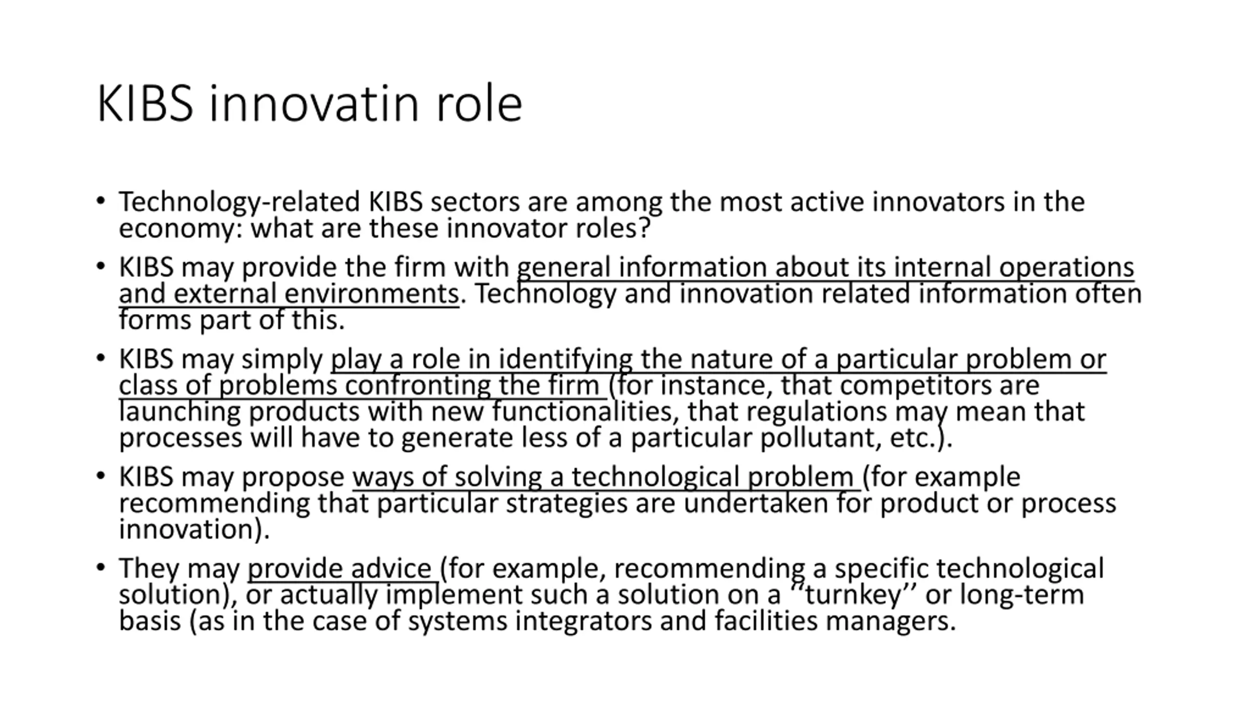 KIBS innovatin role Technology-related KIBS sectors are among the most active innovators in the economy: what are these innovator roles? KIBS may provide the firm with general information about its internal operations and external environments. Technology and innovation related information often forms part of this. KIBS may simply play a role in identifying the nature of a particular problem or class of problems confronting the firm (for instance, that competitors are launching products with new functionalities, that regulations may mean that processes will have to generate less of a particular pollutant, etc.). KIBS may propose ways of solving a technological problem (for example recommending that particular strategies are undertaken for product or process innovation). They may provide advice (for example, recommending a specific technological solution), or actually implement such a solution on a turnkey or long-term basis (as in the case of systems integrators and facilities managers.