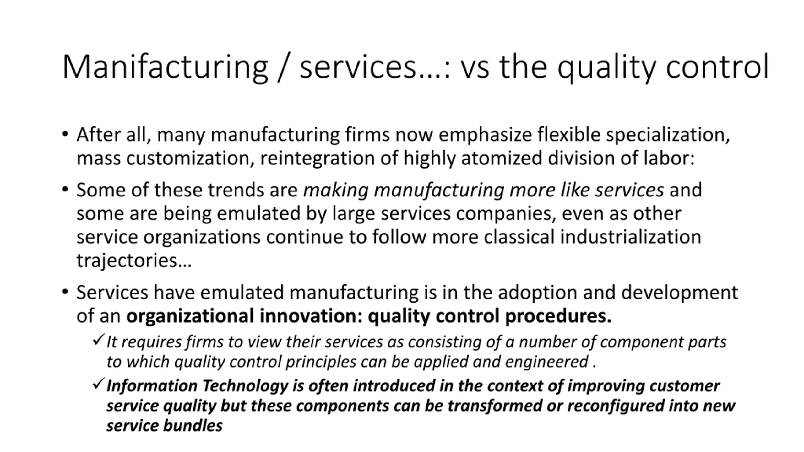 Manifacturing / services: vs the quality control After all, many manufacturing firms now emphasize flexible specialization, mass customization, reintegration of highly atomized division of labor: Some of these trends are making manufacturing more like services and some are being emulated by large services companies, even as other service organizations continue to follow more classical industrialization trajectories Services have emulated manufacturing is in the adoption and development of an organizational innovation: quality control procedures. It requires firms to view their services as consisting of a number of component parts to which quality control principles can be applied and engineered . Information Technology is often introduced in the context of improving customer service quality but these components can be transformed or reconfigured into new service bundles