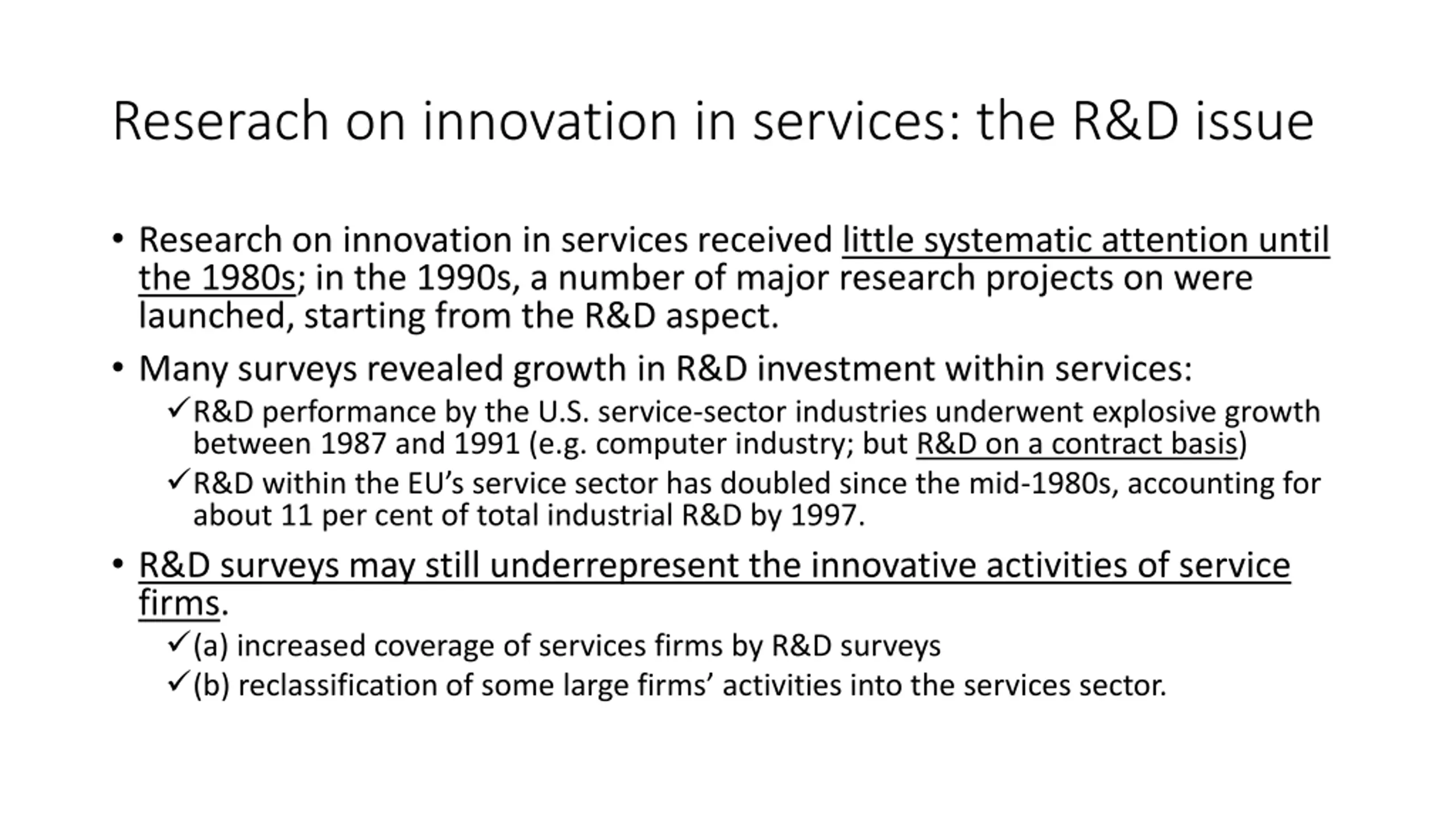 Reserach on innovation in services: the R&D issue Research on innovation in services received little systematic attention until the 1980s; in the 1990s, a number of major research projects on were launched, starting from the R&D aspect. Many surveys revealed growth in R&D investment within services: R&D performance by the U.S. service-sector industries underwent explosive growth between 1987 and 1991 (e.g. computer industry; but R&D on a contract basis) R&D within the EU s service sector has doubled since the mid-1980s, accounting for about 11 per cent of total industrial R&D by 1997. R&D surveys may still underrepresent the innovative activities of service firms. (a) increased coverage of services firms by R&D surveys (b) reclassification of some large firms activities into the services sector.
