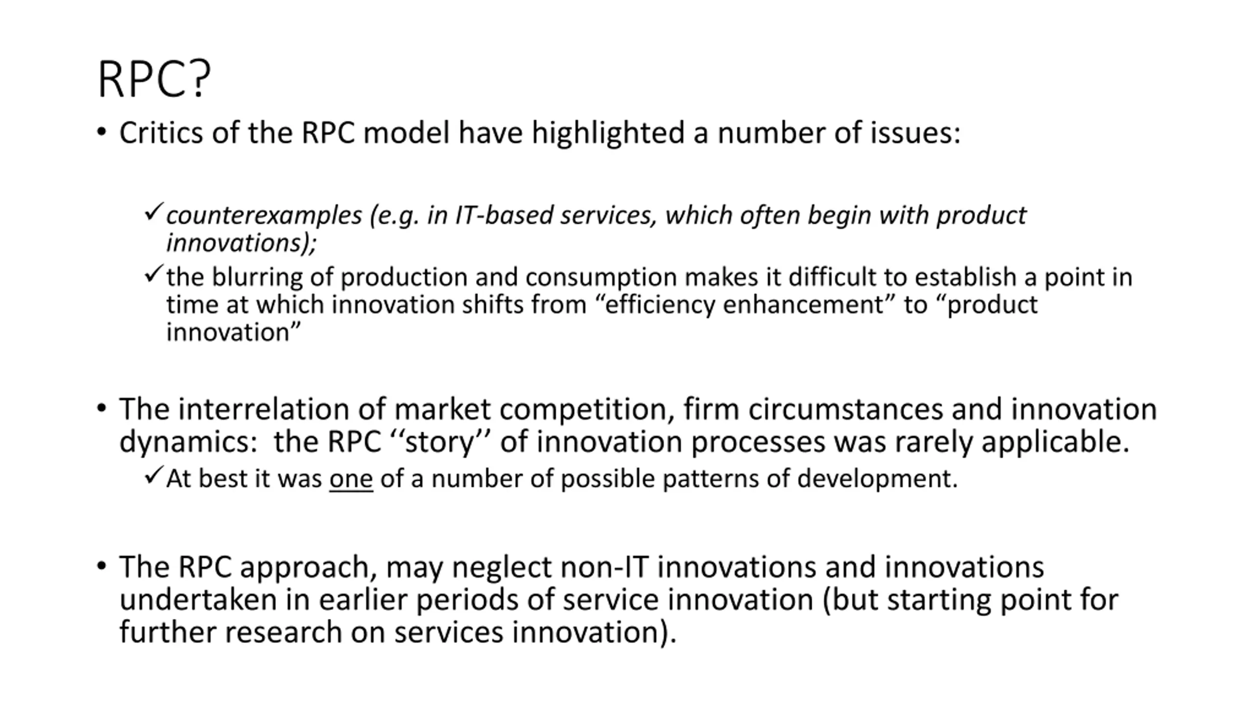 RPC? Critics of the RPC model have highlighted a number of issues: counterexamples (e.g. in IT-based services, which often begin with product innovations); the blurring of production and consumption makes it difficult to establish a point in time at which innovation shifts from efficiency enhancement to product innovation The interrelation of market competition, firm circumstances and innovation dynamics: the RPC story of innovation processes was rarely applicable. At best it was one of a number of possible patterns of development. The RPC approach, may neglect non-IT innovations and innovations undertaken in earlier periods of service innovation (but starting point for further research on services innovation).
