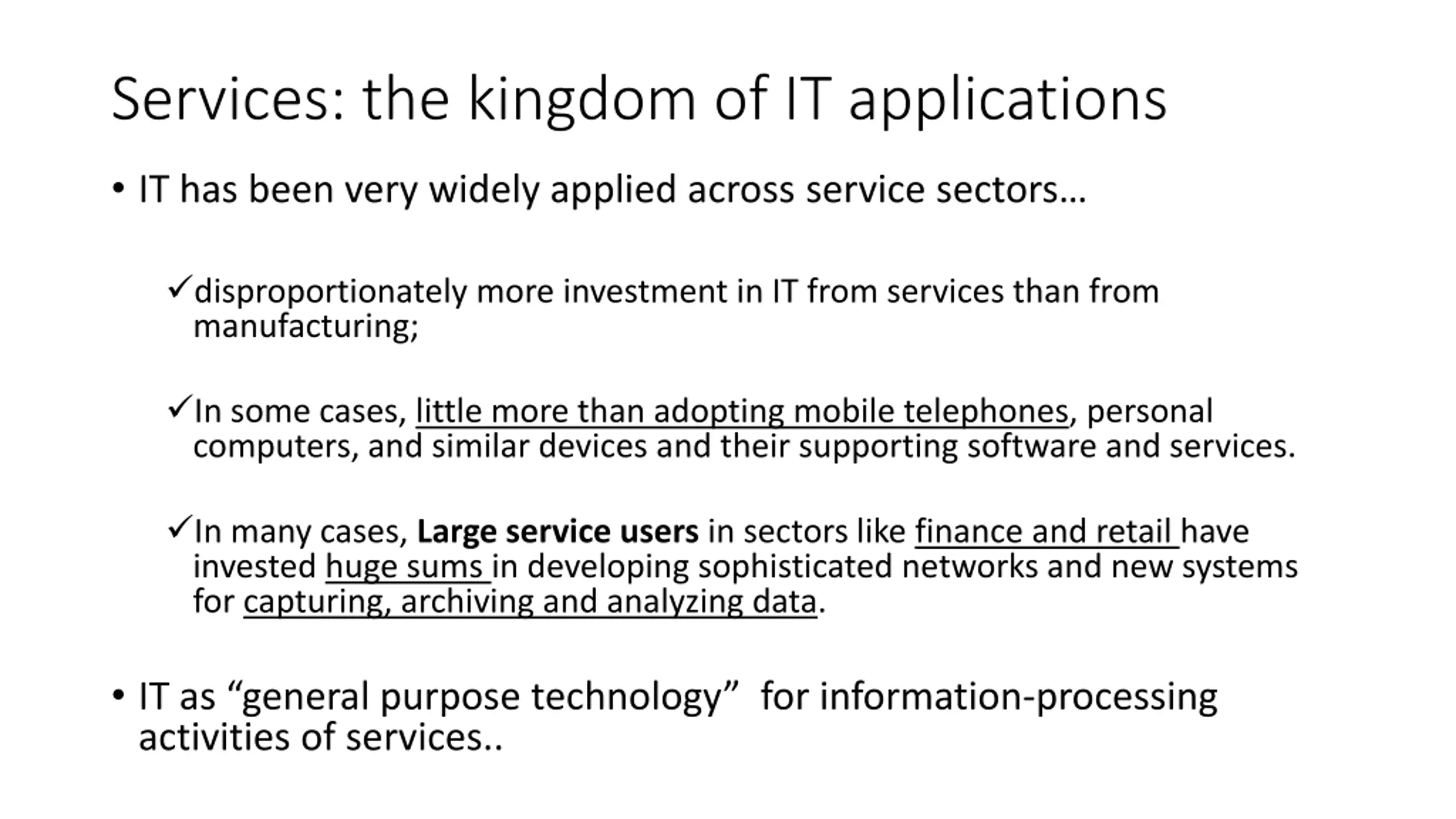 Services: the kingdom of IT applications IT has been very widely applied across service sectors disproportionately more investment in IT from services than from manufacturing; In some cases, little more than adopting mobile telephones, personal computers, and similar devices and their supporting software and services. In many cases, Large service users in sectors like finance and retail have invested huge sums in developing sophisticated networks and new systems for capturing, archiving and analyzing data. IT as general purpose technology for information-processing activities of services..