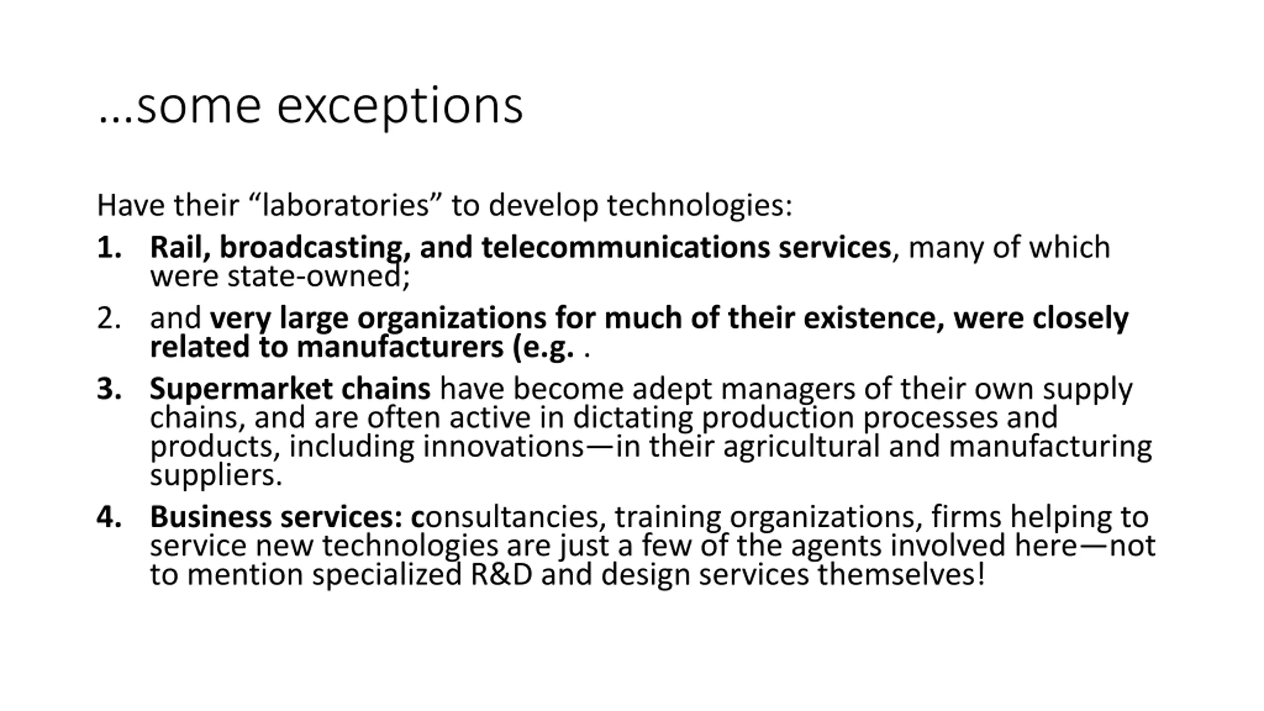 some exceptions Have their laboratories to develop technologies: 1. Rail, broadcasting, and telecommunications services, many of which were state-owned; 2. and very large organizations for much of their existence, were closely related to manufacturers (e.g. . 3. Supermarket chains have become adept managers of their own supply chains, and are often active in dictating production processes and products, including innovations in their agricultural and manufacturing suppliers. 4. Business services: consultancies, training organizations, firms helping to service new technologies are just a few of the agents involved here not to mention specialized R&D and design services themselves!