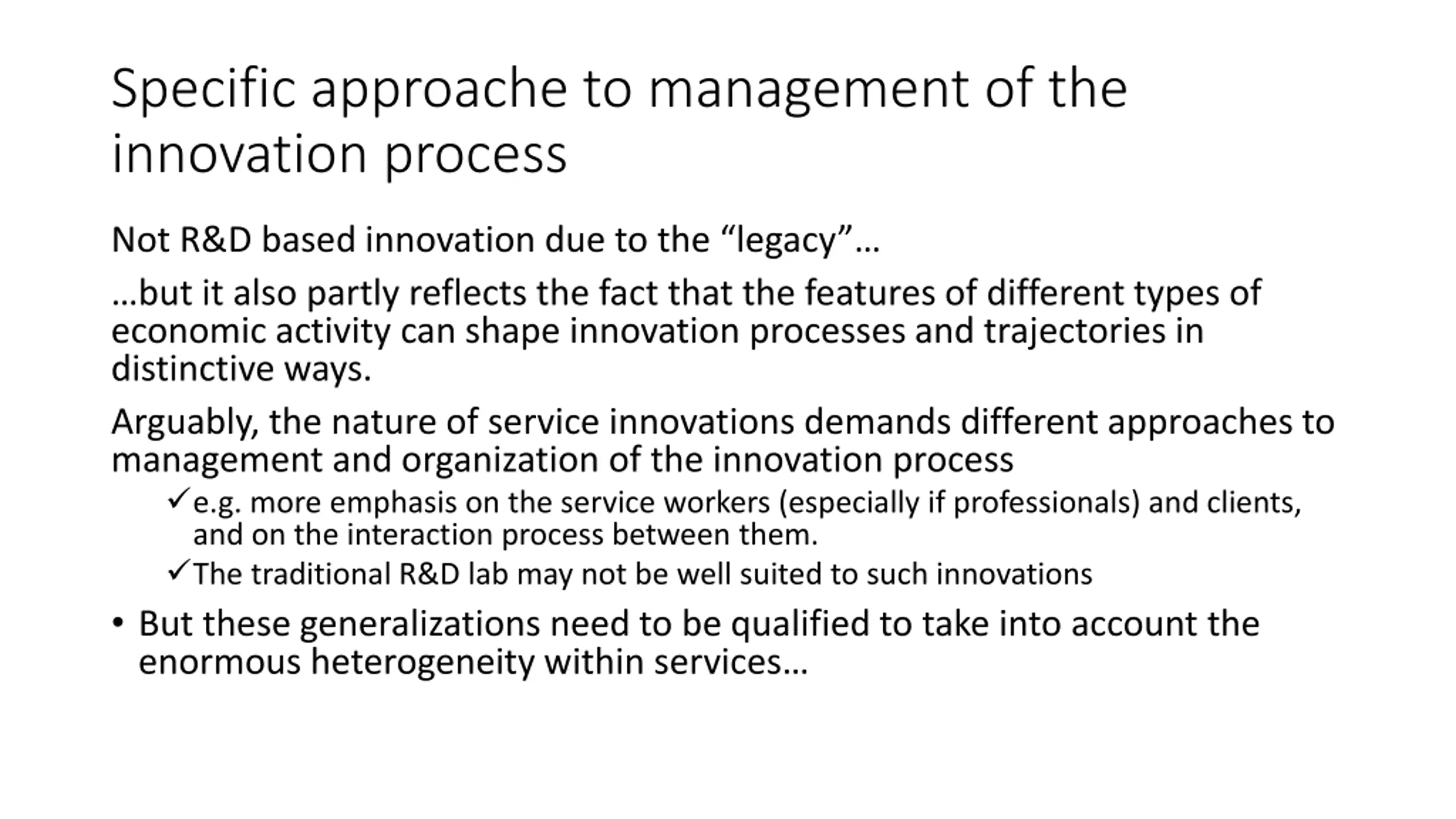 Specific approache to management of the innovation process Not R&D based innovation due to the legacy but it also partly reflects the fact that the features of different types of economic activity can shape innovation processes and trajectories in distinctive ways. Arguably, the nature of service innovations demands different approaches to management and organization of the innovation process e.g. more emphasis on the service workers (especially if professionals) and clients, and on the interaction process between them. The traditional R&D lab may not be well suited to such innovations But these generalizations need to be qualified to take into account the enormous heterogeneity within services