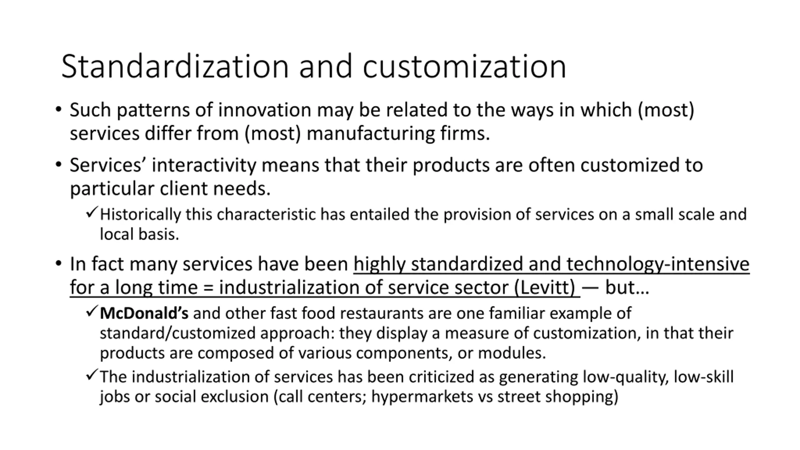 Standardization and customization Such patterns of innovation may be related to the ways in which (most) services differ from (most) manufacturing firms. Services interactivity means that their products are often customized to particular client needs. Historically this characteristic has entailed the provision of services on a small scale and local basis. In fact many services have been highly standardized and technology-intensive for a long time = industrialization of service sector (Levitt) but McDonald s and other fast food restaurants are one familiar example of standard/customized approach: they display a measure of customization, in that their products are composed of various components, or modules. The industrialization of services has been criticized as generating low-quality, low-skill jobs or social exclusion (call centers; hypermarkets vs street shopping)