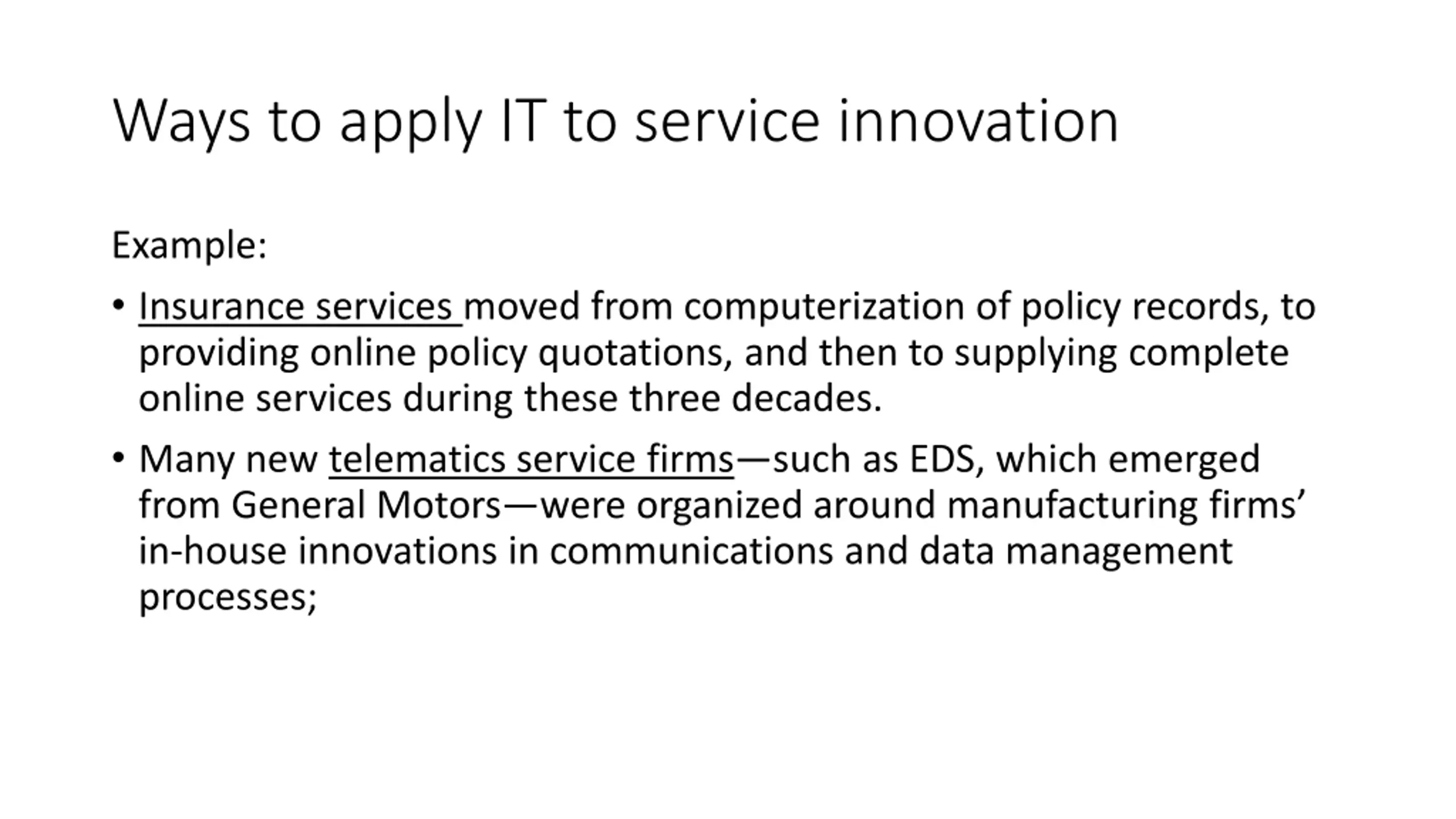 Ways to apply IT to service innovation Example: Insurance services moved from computerization of policy records, to providing online policy quotations, and then to supplying complete online services during these three decades. Many new telematics service firms such as EDS, which emerged from General Motors were organized around manufacturing firms in-house innovations in communications and data management processes;