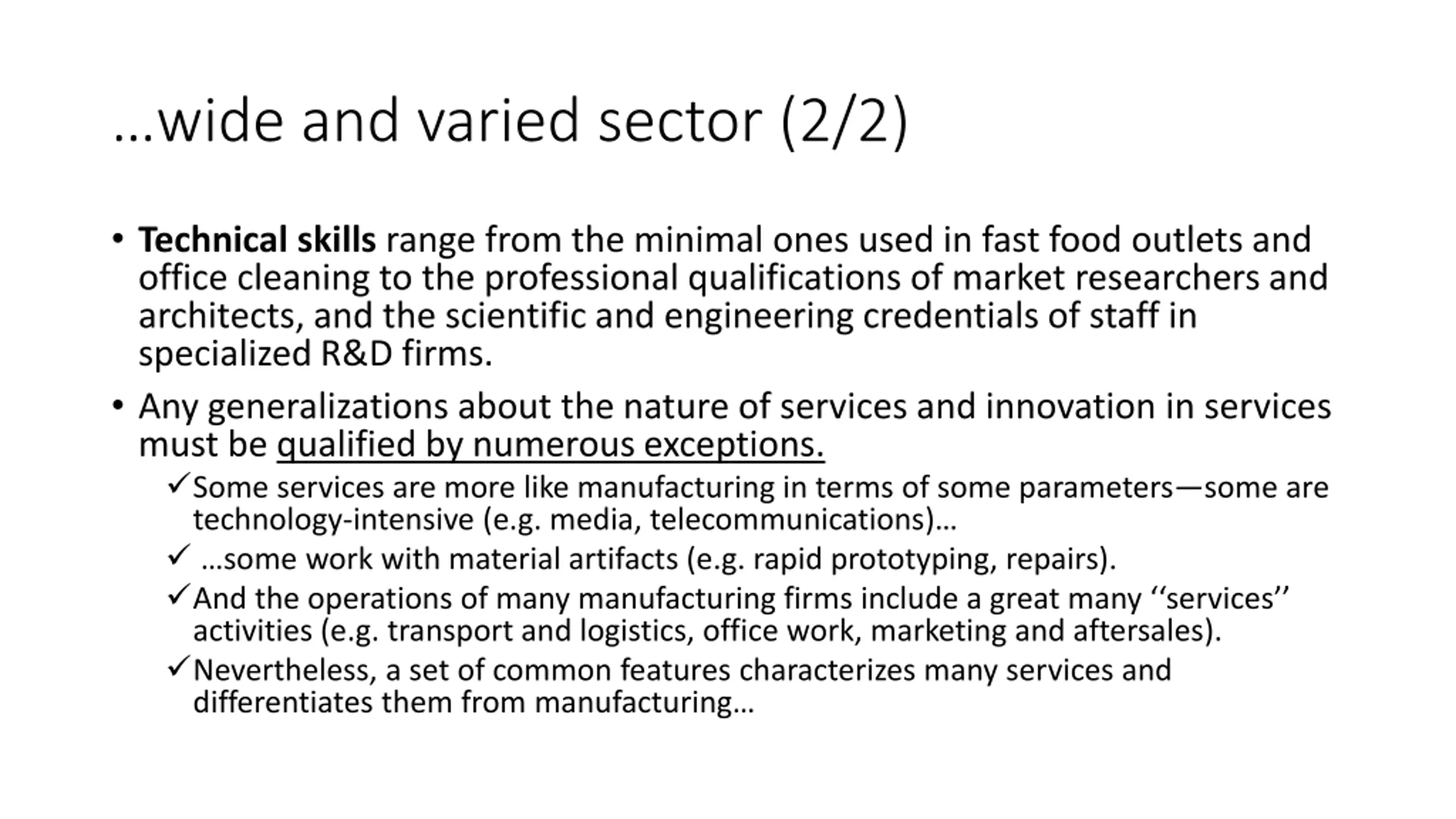 wide and varied sector (2/2) Technical skills range from the minimal ones used in fast food outlets and office cleaning to the professional qualifications of market researchers and architects, and the scientific and engineering credentials of staff in specialized R&D firms. Any generalizations about the nature of services and innovation in services must be qualified by numerous exceptions. Some services are more like manufacturing in terms of some parameters some are technology-intensive (e.g. media, telecommunications) some work with material artifacts (e.g. rapid prototyping, repairs). And the operations of many manufacturing firms include a great many services activities (e.g. transport and logistics, office work, marketing and aftersales). Nevertheless, a set of common features characterizes many services and differentiates them from manufacturing