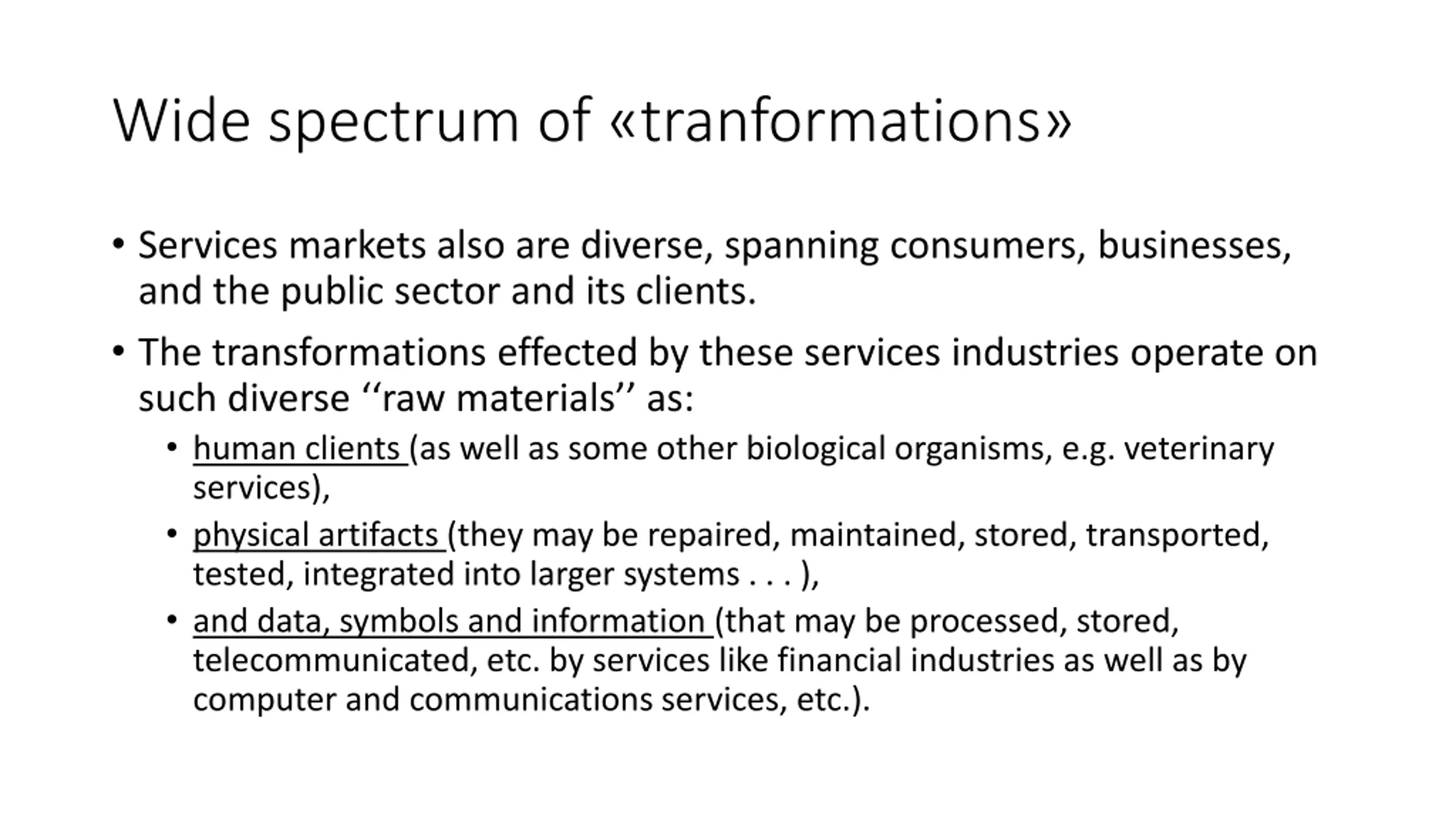 Wide spectrum of tranformations Services markets also are diverse, spanning consumers, businesses, and the public sector and its clients. The transformations effected by these services industries operate on such diverse raw materials as: human clients (as well as some other biological organisms, e.g. veterinary services), physical artifacts (they may be repaired, maintained, stored, transported, tested, integrated into larger systems . . . ), and data, symbols and information (that may be processed, stored, telecommunicated, etc. by services like financial industries as well as by computer and communications services, etc.).