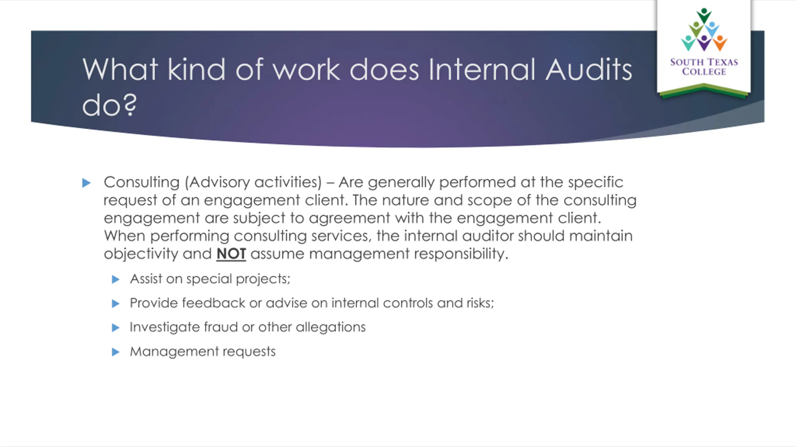 What kind of work does Internal Audits do? Consulting (Advisory activities) Are generally performed at the specific request of an engagement client. The nature and scope of the consulting engagement are subject to agreement with the engagement client. When performing consulting services, the internal auditor should maintain objectivity and NOT assume management responsibility. Assist on special projects; Provide feedback or advise on internal controls and risks; Investigate fraud or other allegations Management requests