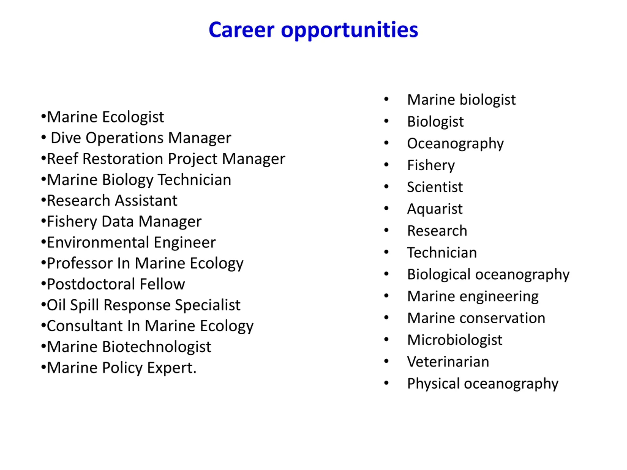 Career opportunities Marine biologist Biologist Oceanography Fishery Scientist Aquarist Research Technician Biological oceanography Marine engineering Marine conservation Microbiologist Veterinarian Physical oceanography Marine Ecologist Dive Operations Manager Reef Restoration Project Manager Marine Biology Technician Research Assistant Fishery Data Manager Environmental Engineer Professor In Marine Ecology Postdoctoral Fellow Oil Spill Response Specialist Consultant In Marine Ecology Marine Biotechnologist Marine Policy Expert.
