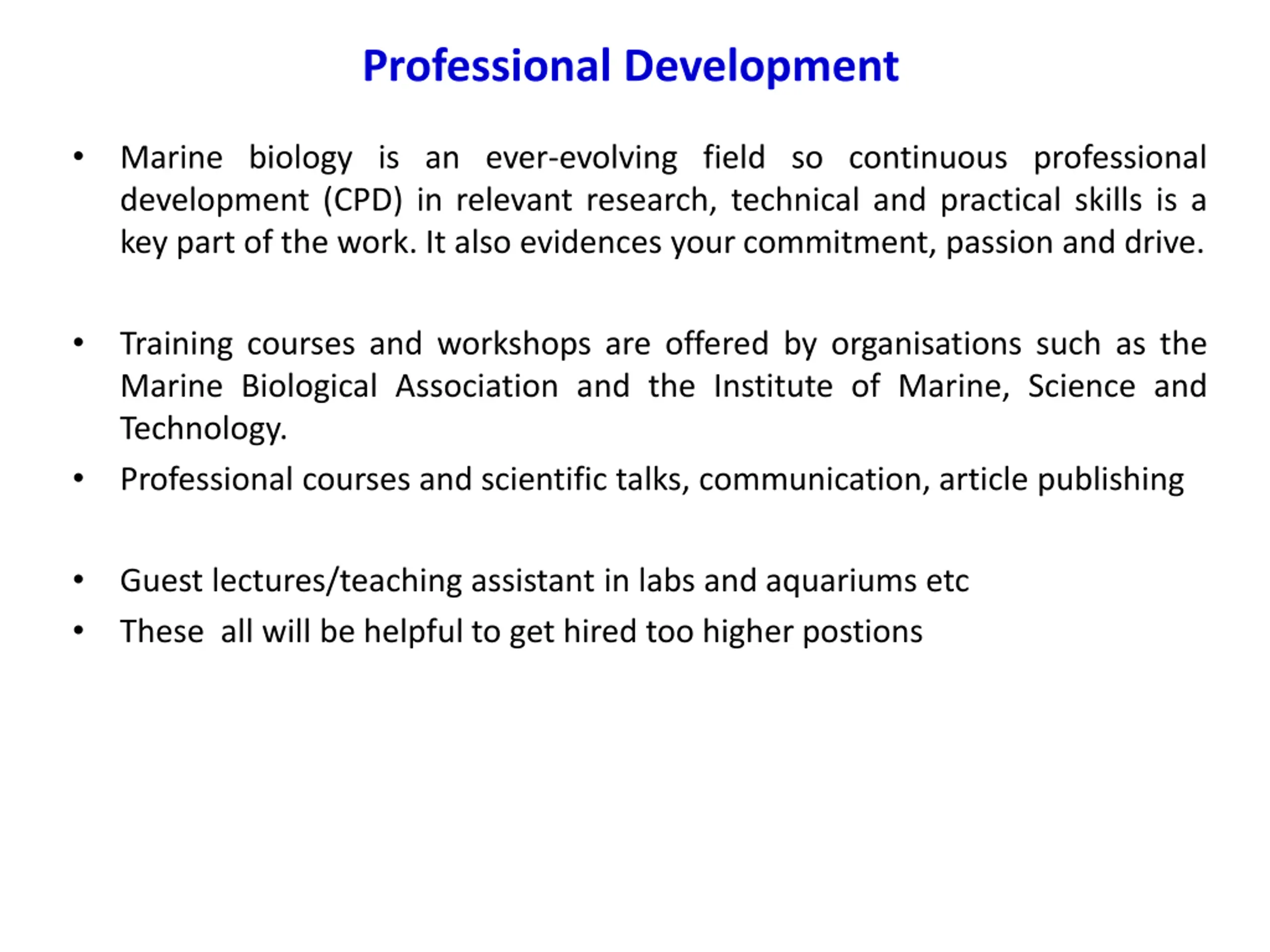 Professional Development Marine biology is an ever-evolving field so continuous professional development (CPD) in relevant research, technical and practical skills is a key part of the work. It also evidences your commitment, passion and drive. Training courses and workshops are offered by organisations such as the Marine Biological Association and the Institute of Marine, Science and Technology. Professional courses and scientific talks, communication, article publishing Guest lectures/teaching assistant in labs and aquariums etc These all will be helpful to get hired too higher postions