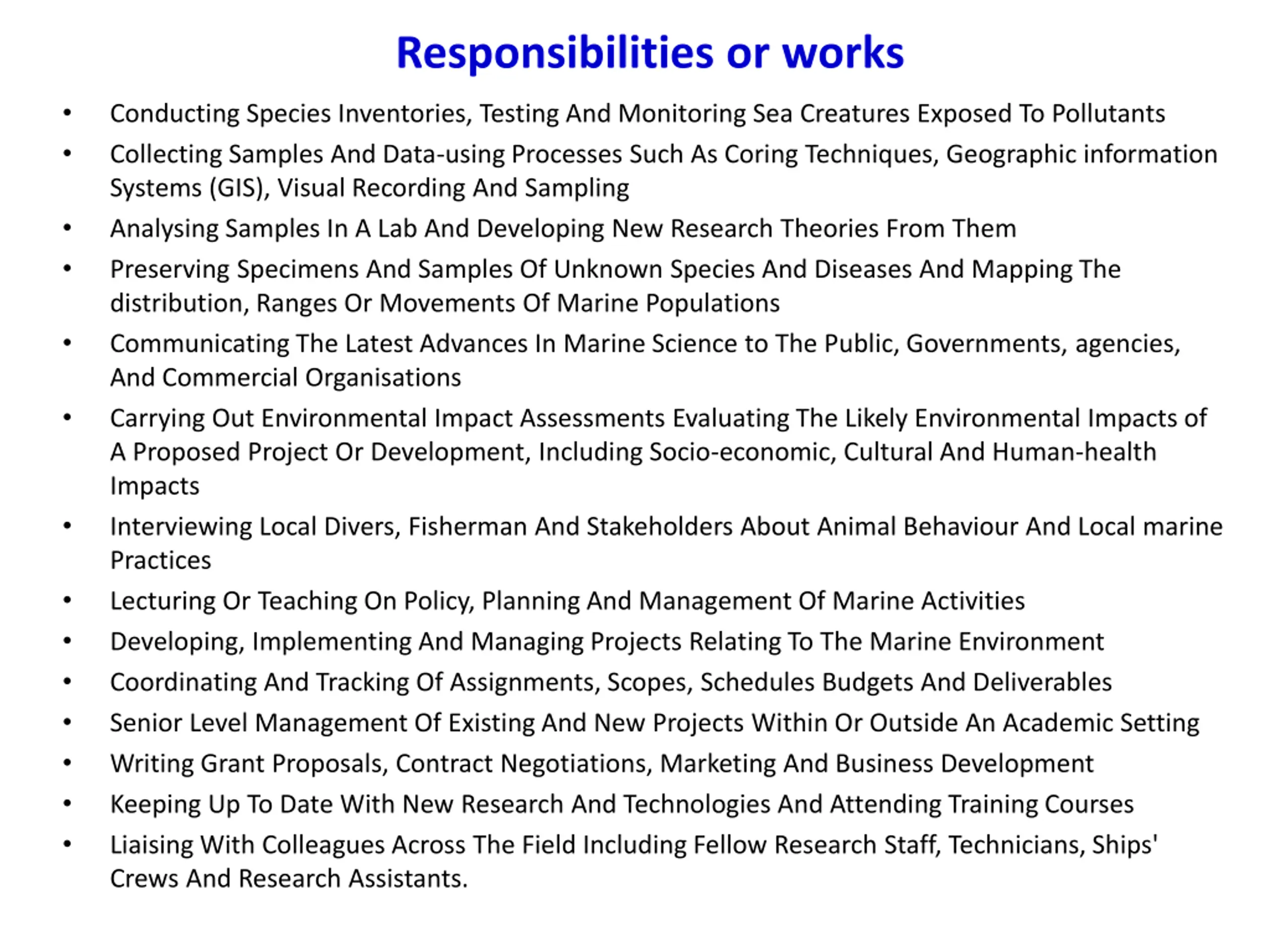 Responsibilities or works Conducting Species Inventories, Testing And Monitoring Sea Creatures Exposed To Pollutants Collecting Samples And Data-using Processes Such As Coring Techniques, Geographic information Systems (GIS), Visual Recording And Sampling Analysing Samples In A Lab And Developing New Research Theories From Them Preserving Specimens And Samples Of Unknown Species And Diseases And Mapping The distribution, Ranges Or Movements Of Marine Populations Communicating The Latest Advances In Marine Science to The Public, Governments, agencies, And Commercial Organisations Carrying Out Environmental Impact Assessments Evaluating The Likely Environmental Impacts of A Proposed Project Or Development, Including Socio-economic, Cultural And Human-health Impacts Interviewing Local Divers, Fisherman And Stakeholders About Animal Behaviour And Local marine Practices Lecturing Or Teaching On Policy, Planning And Management Of Marine Activities Developing, Implementing And Managing Projects Relating To The Marine Environment Coordinating And Tracking Of Assignments, Scopes, Schedules Budgets And Deliverables Senior Level Management Of Existing And New Projects Within Or Outside An Academic Setting Writing Grant Proposals, Contract Negotiations, Marketing And Business Development Keeping Up To Date With New Research And Technologies And Attending Training Courses Liaising With Colleagues Across The Field Including Fellow Research Staff, Technicians, Ships' Crews And Research Assistants.