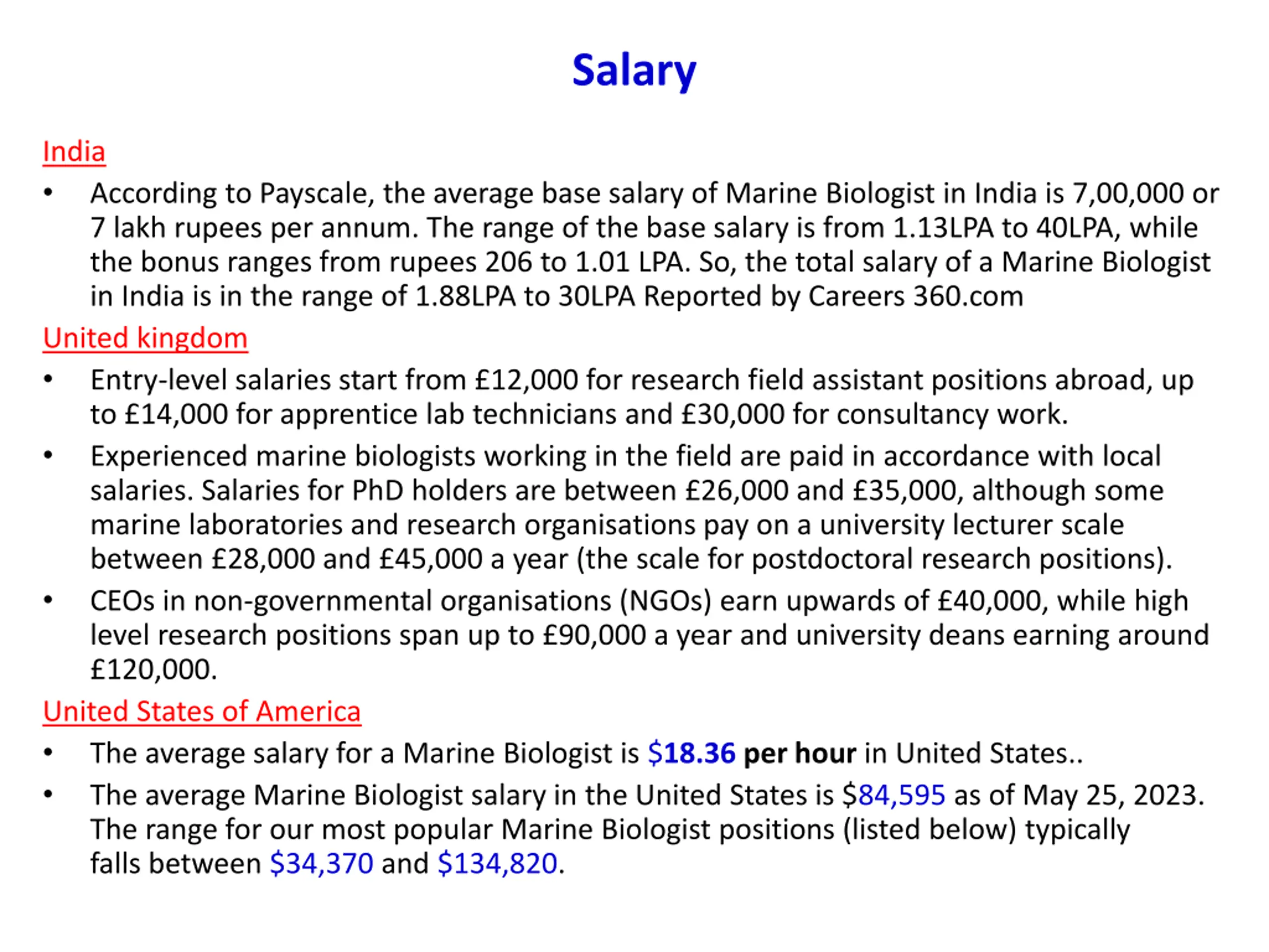 Salary India According to Payscale, the average base salary of Marine Biologist in India is 7,00,000 or 7 lakh rupees per annum. The range of the base salary is from 1.13LPA to 40LPA, while the bonus ranges from rupees 206 to 1.01 LPA. So, the total salary of a Marine Biologist in India is in the range of 1.88LPA to 30LPA Reported by Careers 360.com United kingdom Entry-level salaries start from 12,000 for research field assistant positions abroad, up to 14,000 for apprentice lab technicians and 30,000 for consultancy work. Experienced marine biologists working in the field are paid in accordance with local salaries. Salaries for PhD holders are between 26,000 and 35,000, although some marine laboratories and research organisations pay on a university lecturer scale between 28,000 and 45,000 a year (the scale for postdoctoral research positions). CEOs in non-governmental organisations (NGOs) earn upwards of 40,000, while high level research positions span up to 90,000 a year and university deans earning around 120,000. United States of America The average salary for a Marine Biologist is $18.36 per hour in United States.. The average Marine Biologist salary in the United States is $84,595 as of May 25, 2023. The range for our most popular Marine Biologist positions (listed below) typically falls between $34,370 and $134,820.