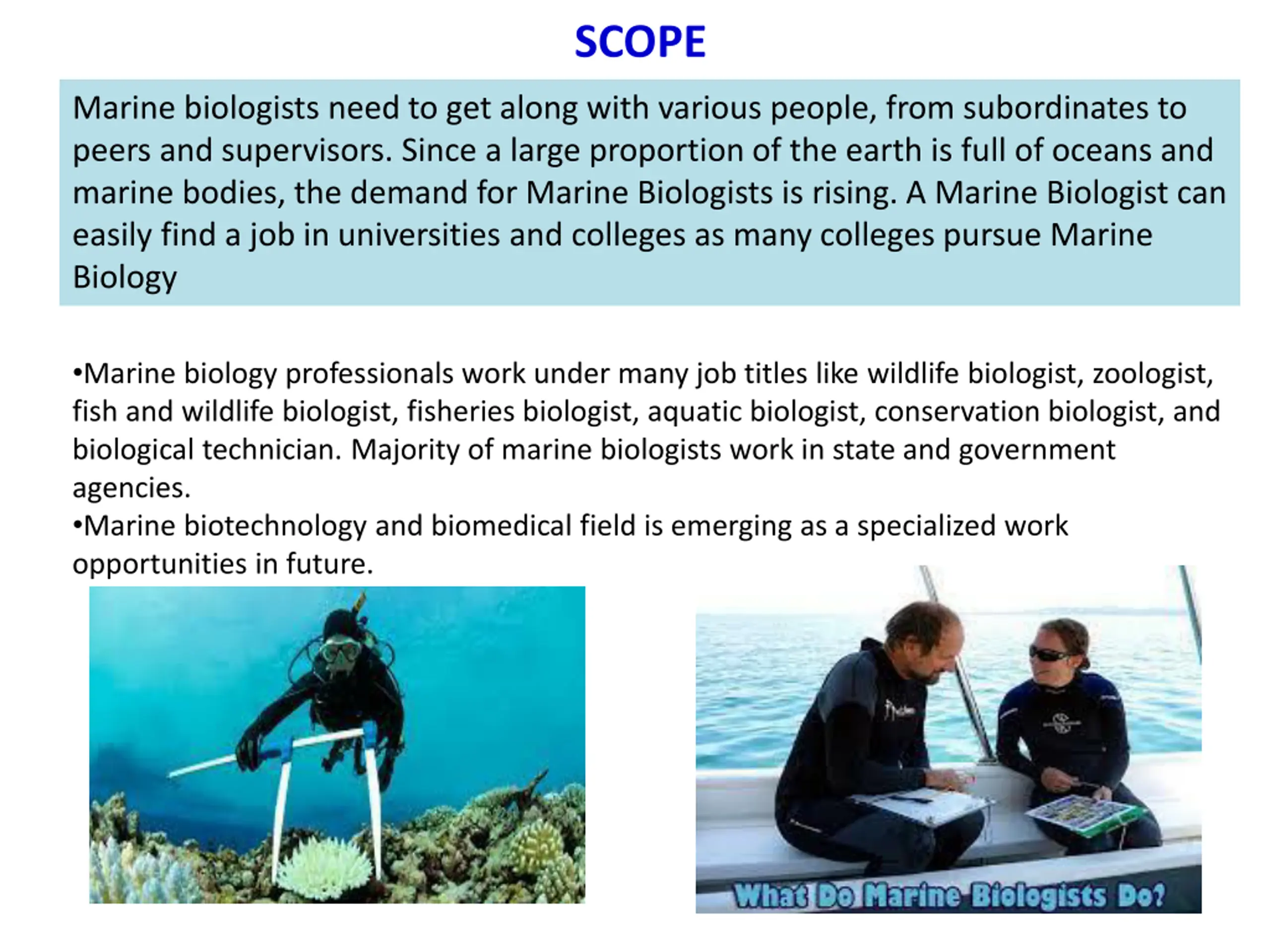 SCOPE Marine biologists need to get along with various people, from subordinates to peers and supervisors. Since a large proportion of the earth is full of oceans and marine bodies, the demand for Marine Biologists is rising. A Marine Biologist can easily find a job in universities and colleges as many colleges pursue Marine Biology Marine biology professionals work under many job titles like wildlife biologist, zoologist, fish and wildlife biologist, fisheries biologist, aquatic biologist, conservation biologist, and biological technician. Majority of marine biologists work in state and government agencies. Marine biotechnology and biomedical field is emerging as a specialized work opportunities in future.