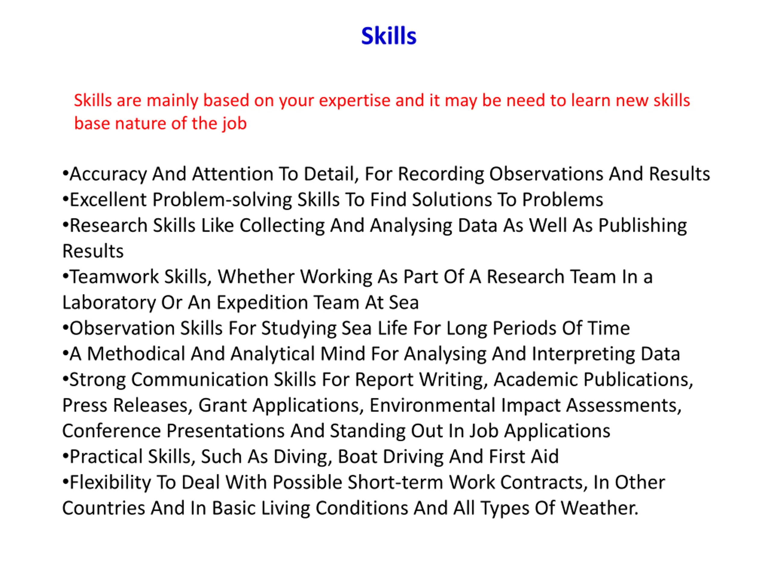 Skills Skills are mainly based on your expertise and it may be need to learn new skills base nature of the job Accuracy And Attention To Detail, For Recording Observations And Results Excellent Problem-solving Skills To Find Solutions To Problems Research Skills Like Collecting And Analysing Data As Well As Publishing Results Teamwork Skills, Whether Working As Part Of A Research Team In a Laboratory Or An Expedition Team At Sea Observation Skills For Studying Sea Life For Long Periods Of Time A Methodical And Analytical Mind For Analysing And Interpreting Data Strong Communication Skills For Report Writing, Academic Publications, Press Releases, Grant Applications, Environmental Impact Assessments, Conference Presentations And Standing Out In Job Applications Practical Skills, Such As Diving, Boat Driving And First Aid Flexibility To Deal With Possible Short-term Work Contracts, In Other Countries And In Basic Living Conditions And All Types Of Weather.