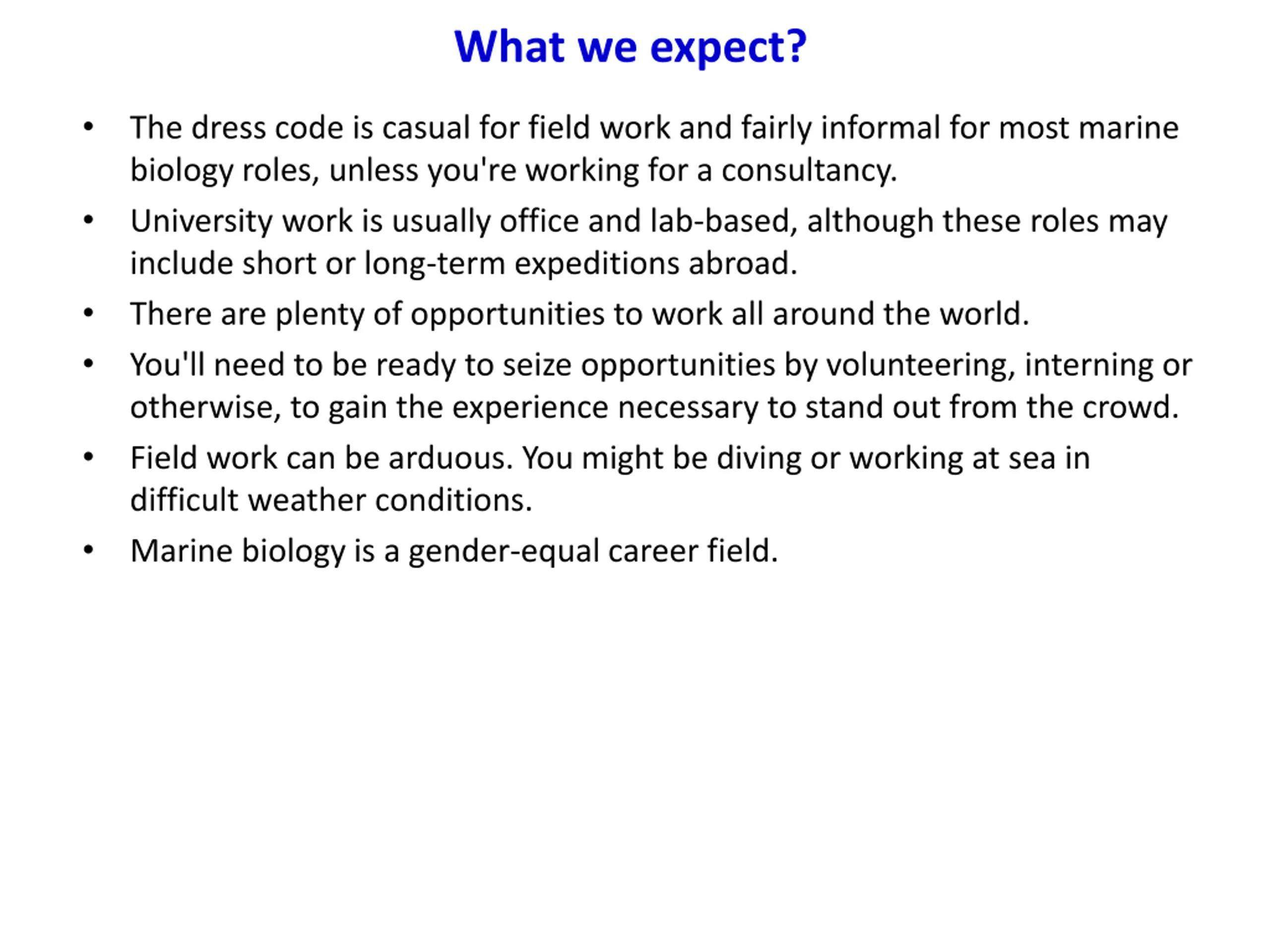 What we expect? The dress code is casual for field work and fairly informal for most marine biology roles, unless you're working for a consultancy. University work is usually office and lab-based, although these roles may include short or long-term expeditions abroad. There are plenty of opportunities to work all around the world. You'll need to be ready to seize opportunities by volunteering, interning or otherwise, to gain the experience necessary to stand out from the crowd. Field work can be arduous. You might be diving or working at sea in difficult weather conditions. Marine biology is a gender-equal career field.