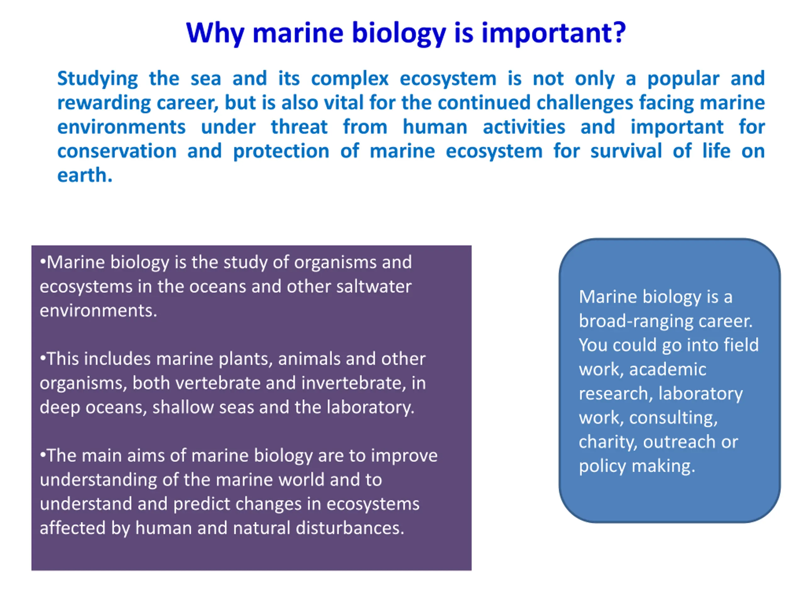 Why marine biology is important? Studying the sea and its complex ecosystem is not only a popular and rewarding career, but is also vital for the continued challenges facing marine environments under threat from human activities and important for conservation and protection of marine ecosystem for survival of life on earth. Marine biology is the study of organisms and ecosystems in the oceans and other saltwater environments. Marine biology is a broad-ranging career. You could go into field work, academic research, laboratory work, consulting, charity, outreach or policy making. This includes marine plants, animals and other organisms, both vertebrate and invertebrate, in deep oceans, shallow seas and the laboratory. The main aims of marine biology are to improve understanding of the marine world and to understand and predict changes in ecosystems affected by human and natural disturbances.