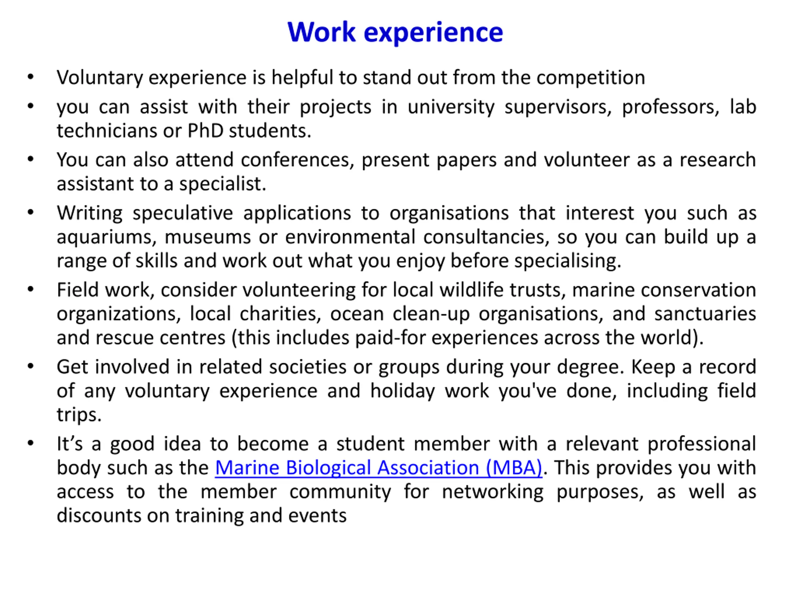 Work experience Voluntary experience is helpful to stand out from the competition you can assist with their projects in university supervisors, professors, lab technicians or PhD students. You can also attend conferences, present papers and volunteer as a research assistant to a specialist. Writing speculative applications to organisations that interest you such as aquariums, museums or environmental consultancies, so you can build up a range of skills and work out what you enjoy before specialising. Field work, consider volunteering for local wildlife trusts, marine conservation organizations, local charities, ocean clean-up organisations, and sanctuaries and rescue centres (this includes paid-for experiences across the world). Get involved in related societies or groups during your degree. Keep a record of any voluntary experience and holiday work you've done, including field trips. It s a good idea to become a student member with a relevant professional body such as the Marine Biological Association (MBA). This provides you with access to the member community for networking purposes, as well as discounts on training and events